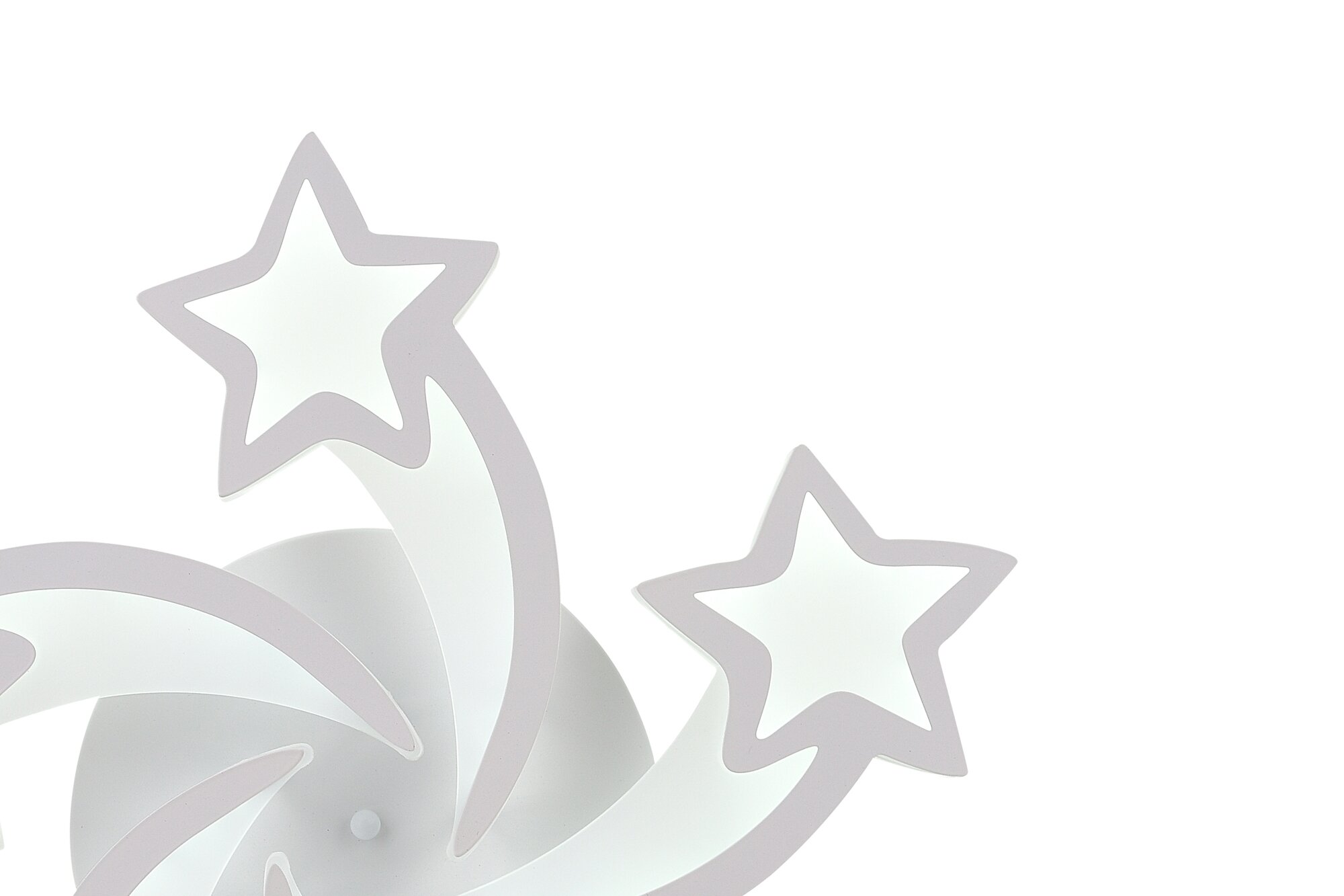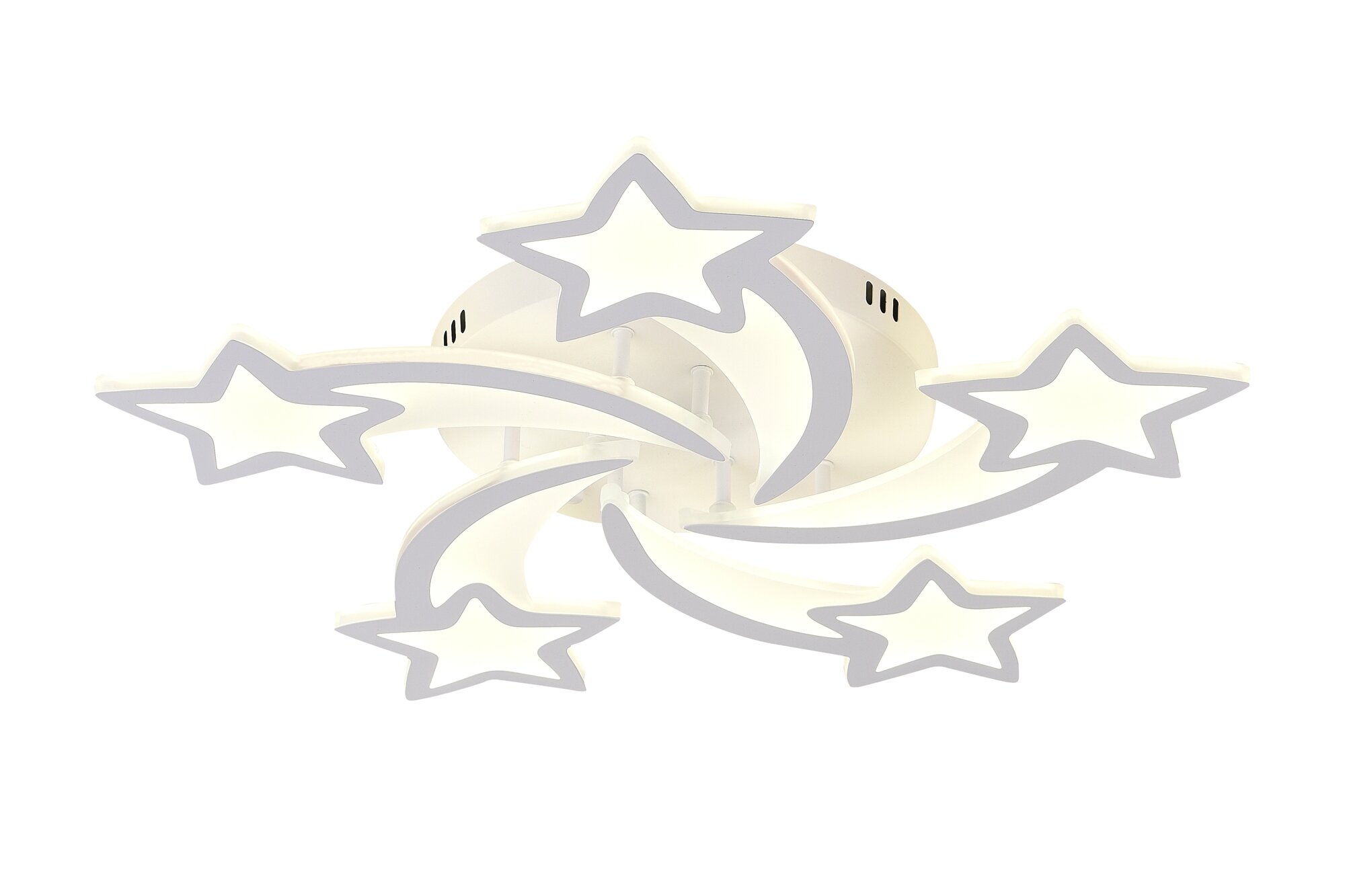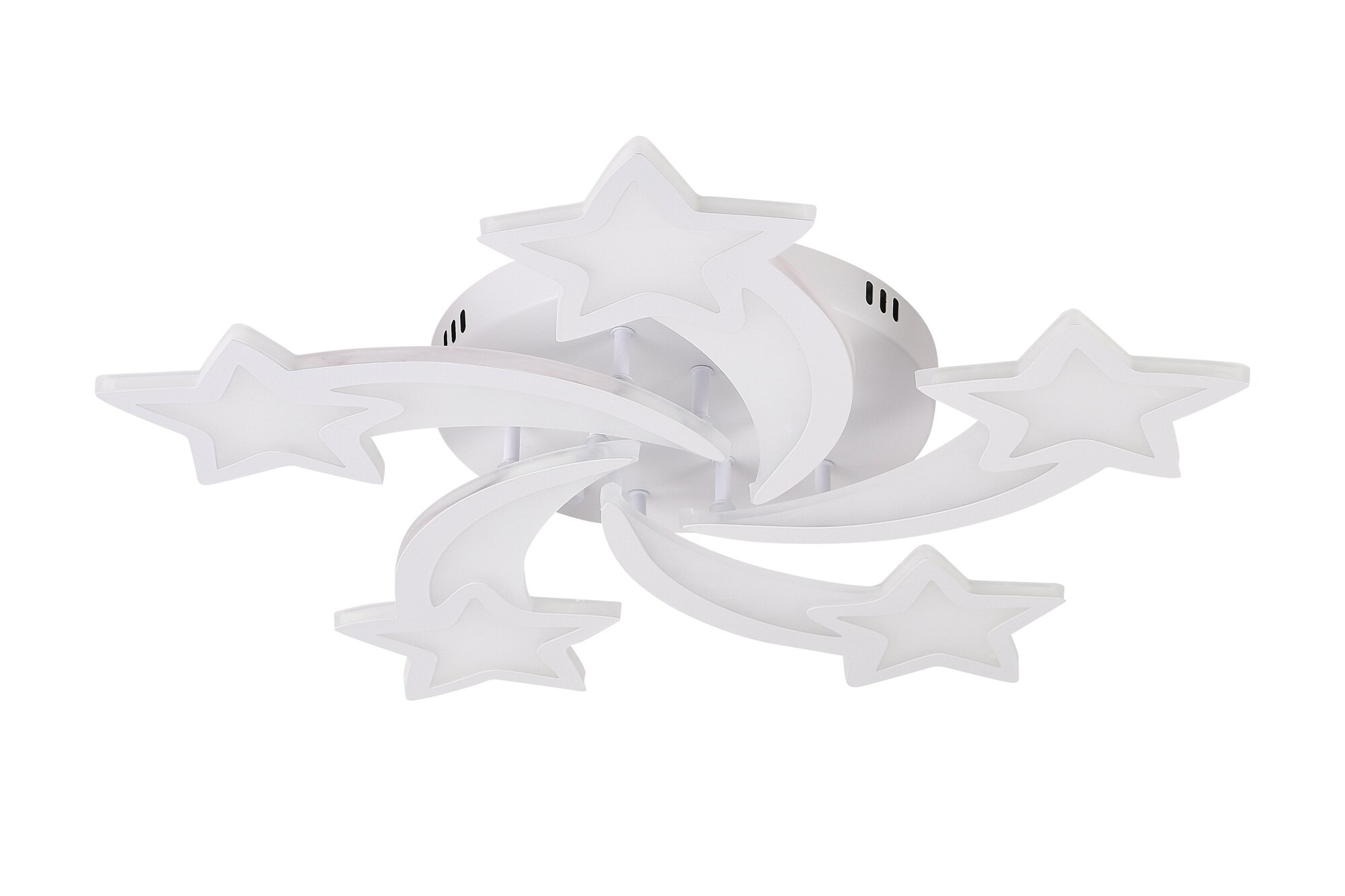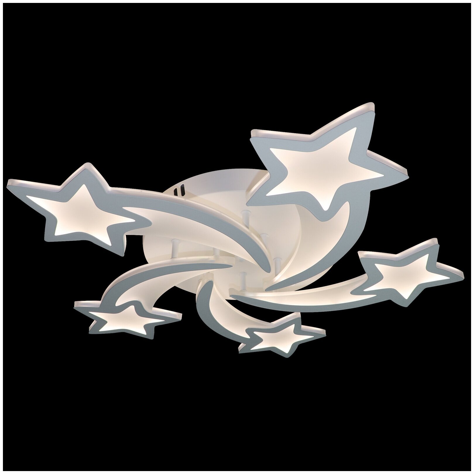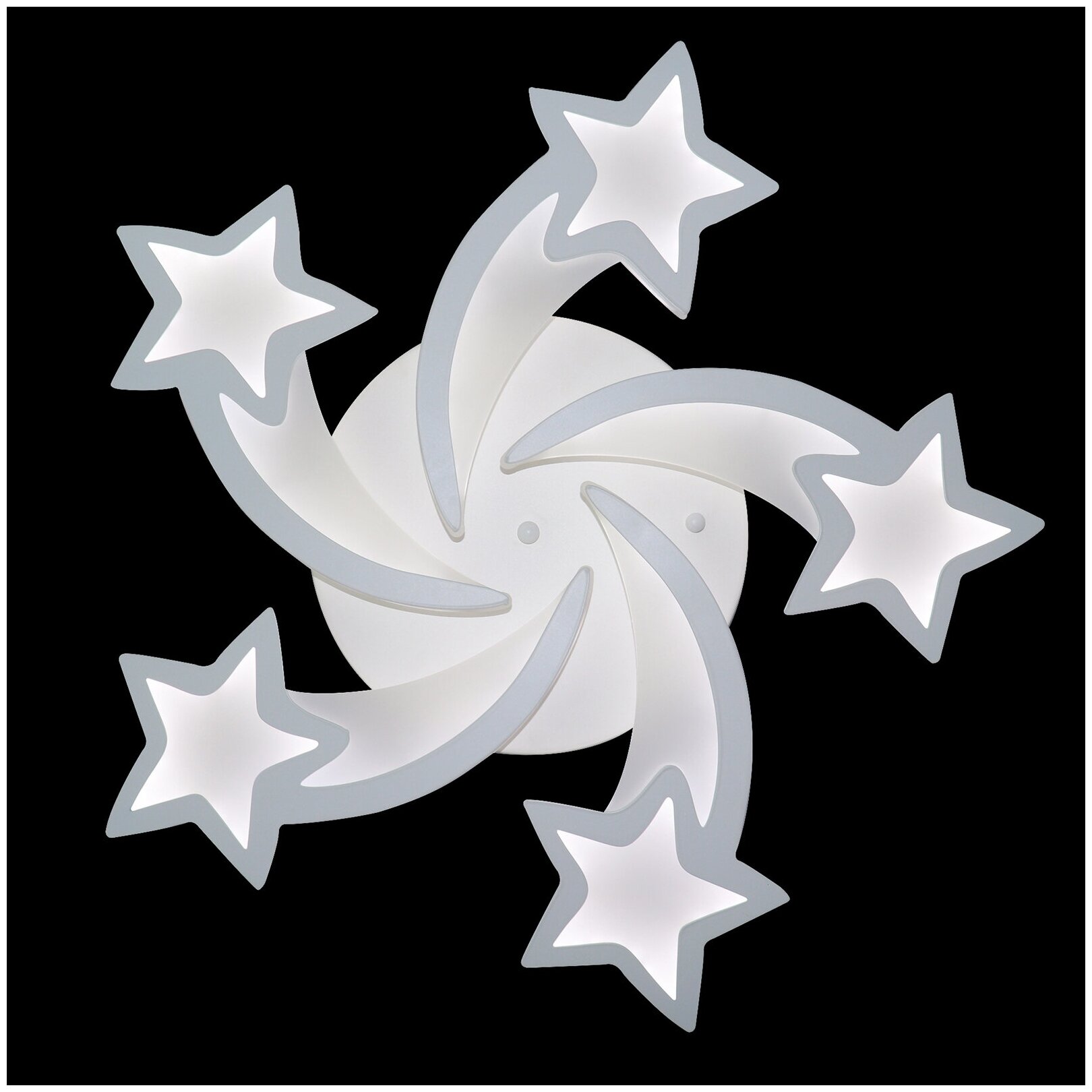 Потолочный светильник из коллекции бренда Natali Kovaltseva станет яркой деталью интерьера, придает ему оригинальность и динамичность.. Пять крупных звезд, будто разлетающихся из общего центра, могут осветить все углы большой комнаты. Стильная модель выполнена из металла и акрила — современного оптического материала. Светодиодный источник энергоэффективен и долговечен, его яркость и цветовую температуру можно плавно изменять при помощи пульта; светильник может использоваться в качестве ночника.