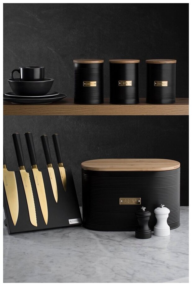 Стильная хлебница Otto на долгое время сохранит любимую выпечку свежей. Для украшения модели дизайнеры используют золотистый декор, который безупречно сочетается с матовым покрытием черного цвета. За счет этого хлебница идеально впишется в классический или современный интерьер кухни. Корпус изделия выполнен из прочной углеродистой стали, которая отличается прочностью и износостойкостью. Хлебница дополнена бамбуковой крышкой, которая при необходимости может служить разделочной доской.