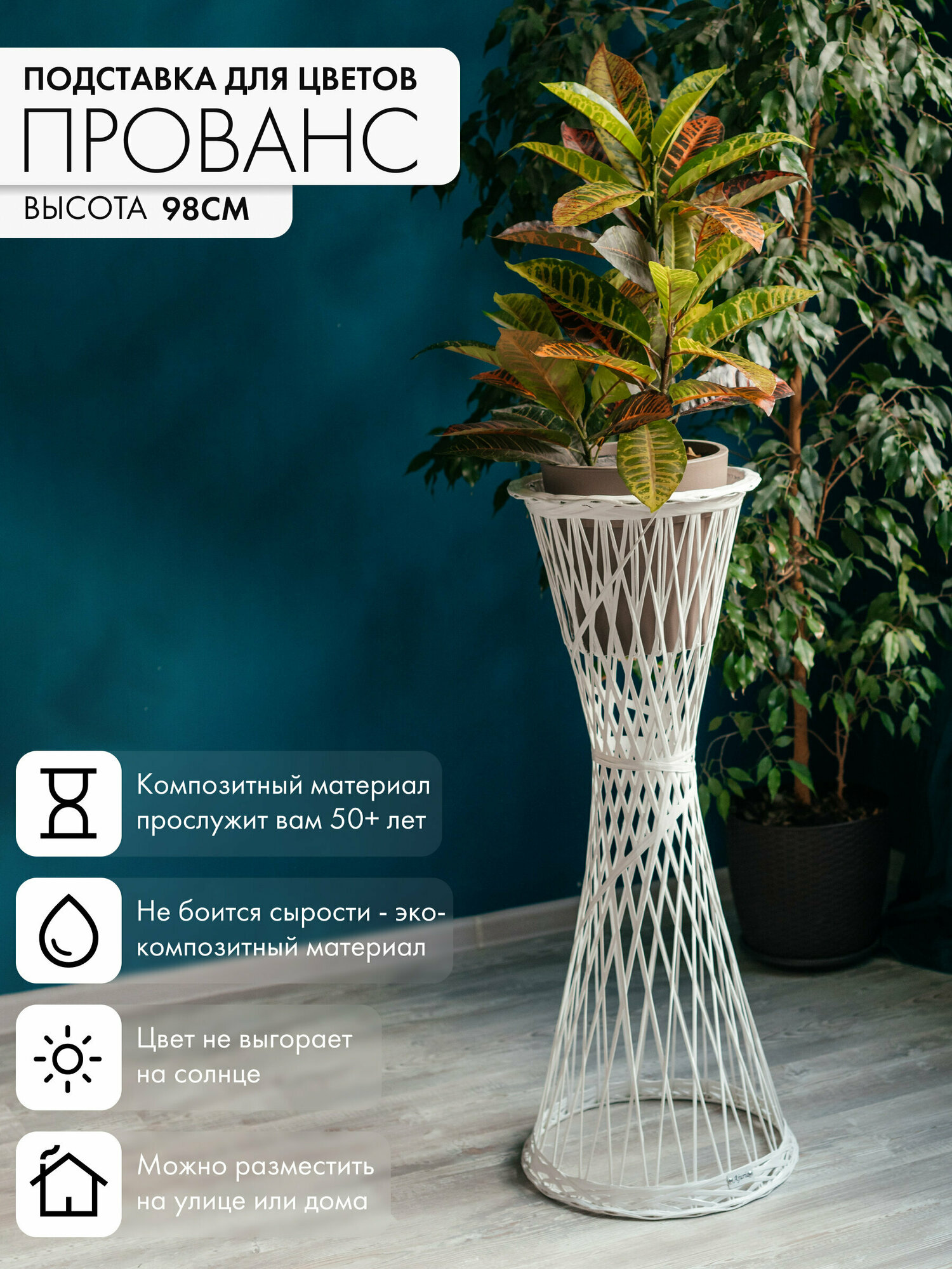 Подставка под цветы напольная станет отличным дополнением к интерьеру в Вашем доме. Цветочница напольная придаст изюминку любой комнате. С такой подставкой для гостиной ваш " домашний сад" заиграет новыми красками. Подставка для цветов выполнена из поликомпозитного материала, который обладает высокой прочностью, износостойкостью, но при этом имеет не большой вес. Напольная подставка для цветов выдержит вес до 100 кг. Она не займет много места и вы без труда сможете ее передвинуть во время уборки или смены интерьера. Универсальный цвет подойдет под многие дизайнерские решения. Садовая подставка создана для уюта в вашем доме и саде. Подставка под растения также может разместиться в саду. Благодаря поликомпозитному материалу подставка для цветов не потеряет первоначальный вид даже при неблагоприятных погодных условиях. Высота составляет 78 см. Каждый наш товар выполнен с любовью и трепетом! Приятных покупок!