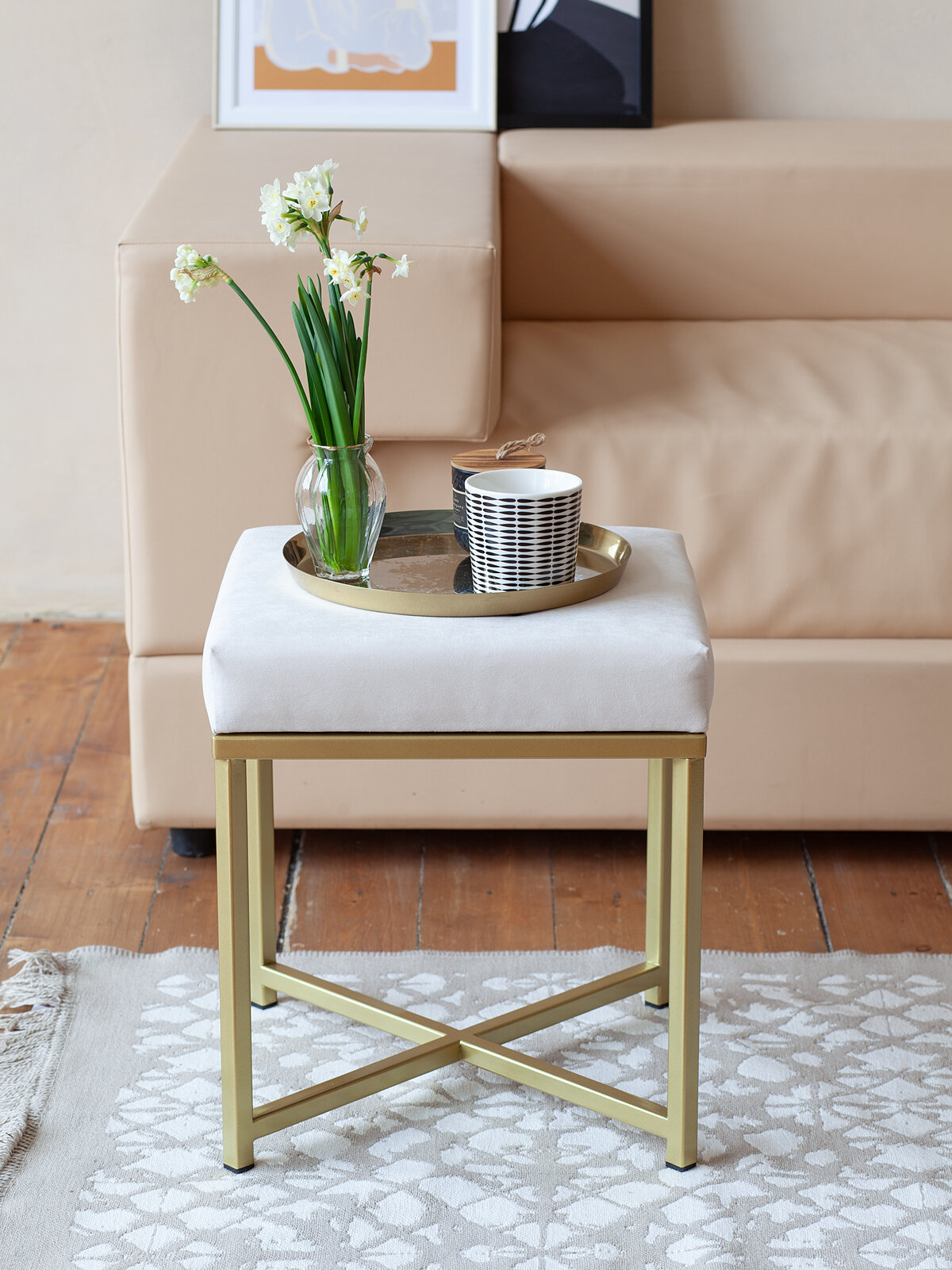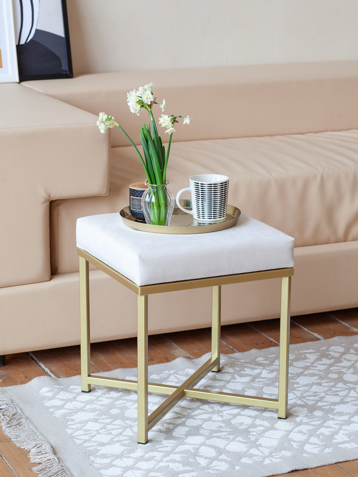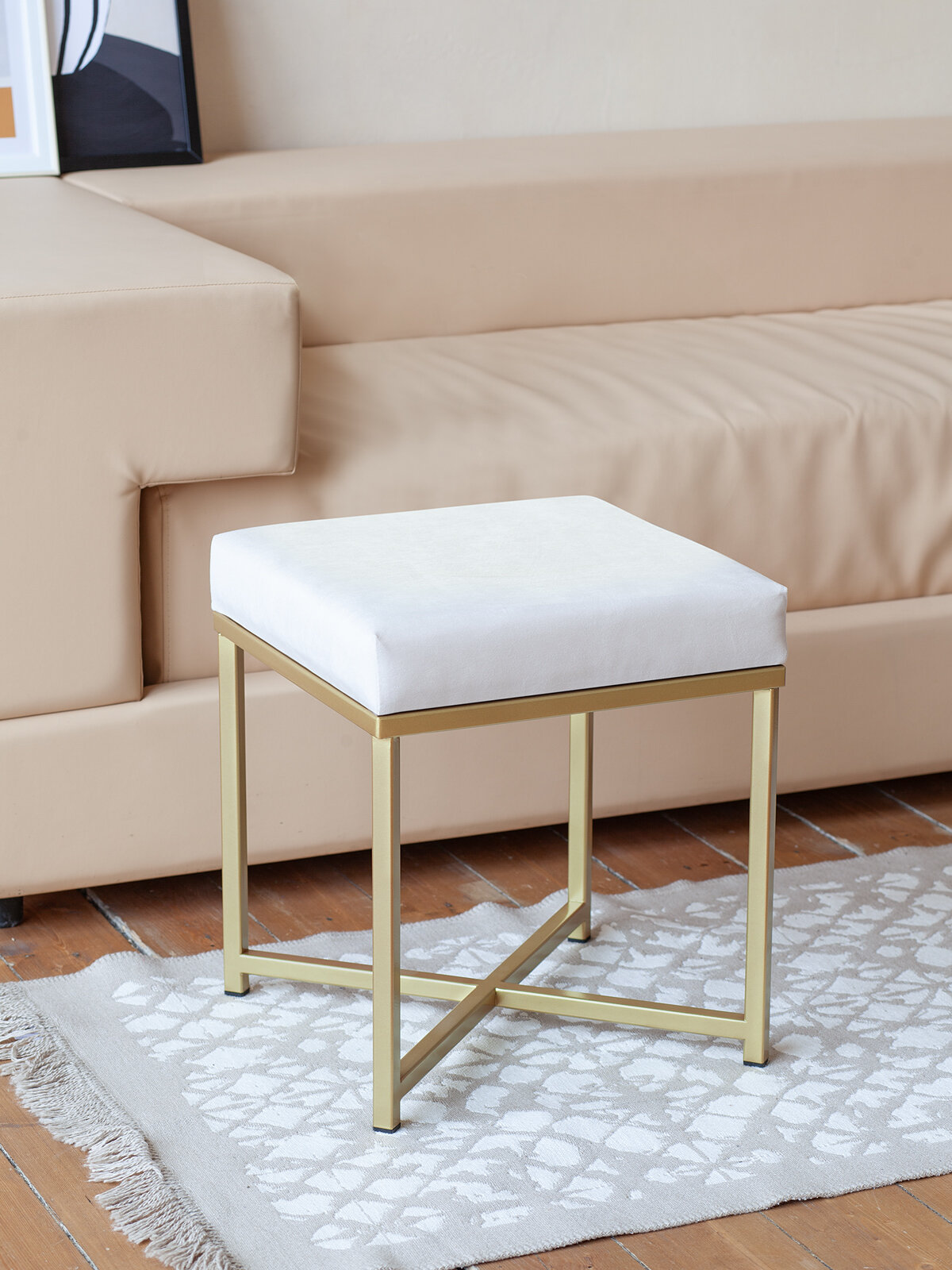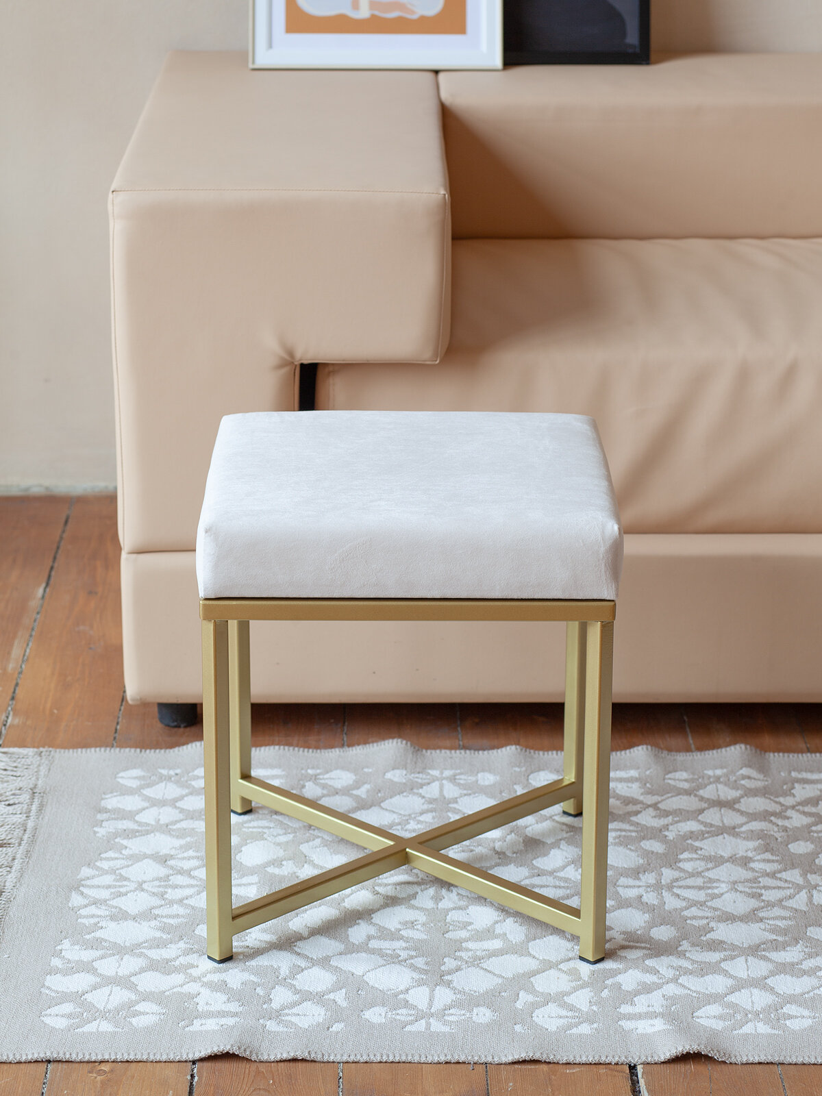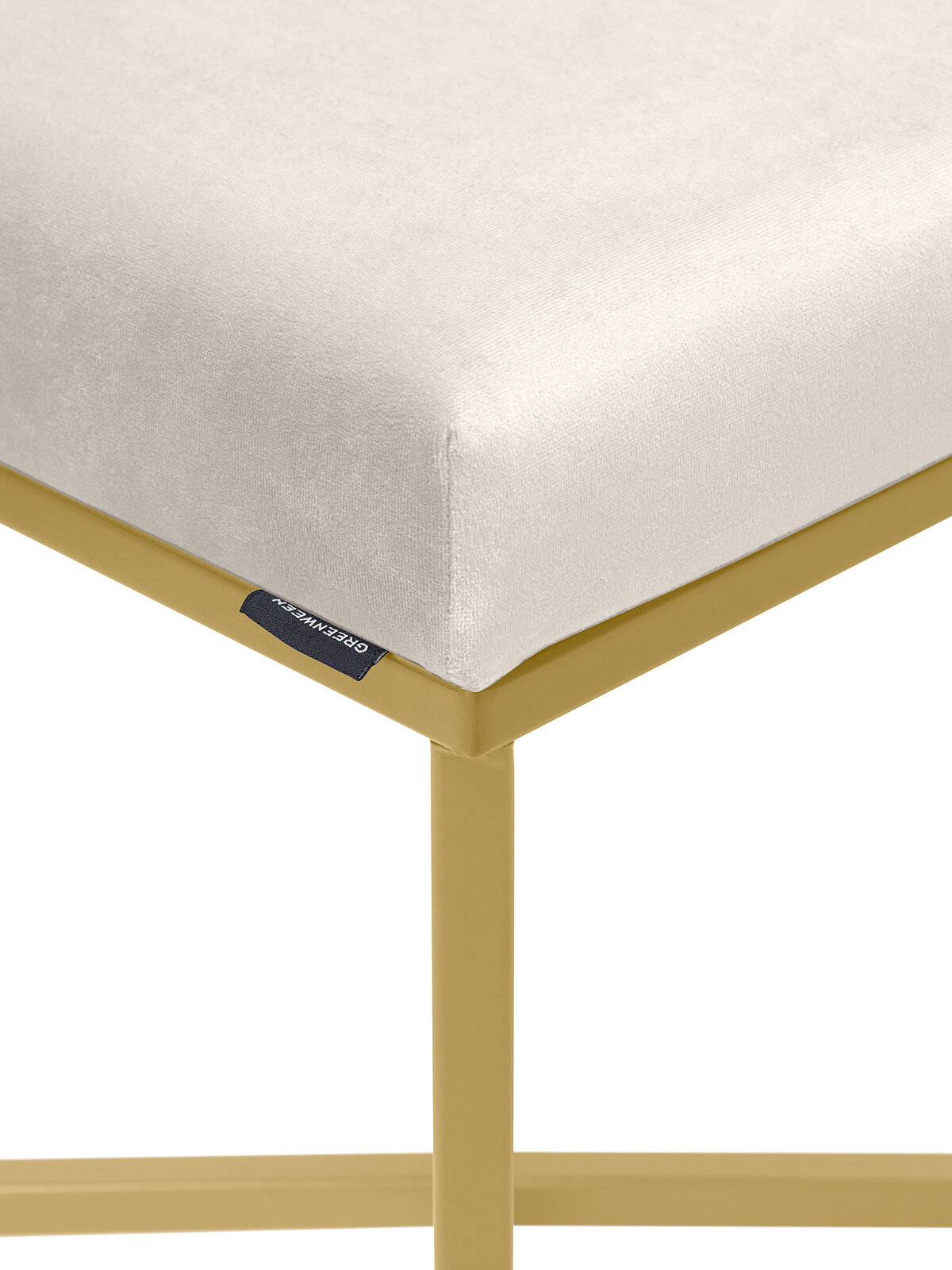 "Пуф на геометрическом основании золотого цвета не оставит равнодушными никого! Устойчивый, стильный, удобный - это о нем. Отлично впишется в лофт и сканди интерьер, можно разместить как в спальне, так и в зале и даже прихожей. Толщина мягкой поролоновой набивки 8 см, обивка выполнена велюром в светло-сером цвете. Основание покрыто золотой краской, устойчивой к царапинам. Отлично сочетается с другими товарами для дома бренда GreenWeen серии Loft — банкетками и столиками.