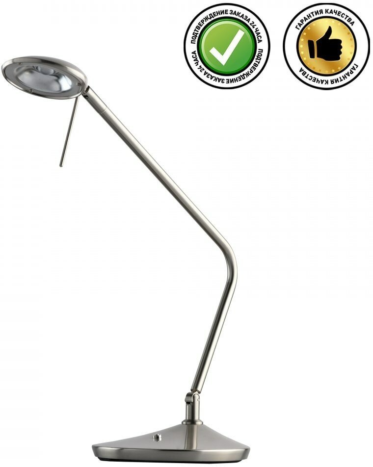 Компактная настольная лампа Гэлэкси способна осветить всю рабочую зону стола. Ножка гнется в «колене», плафон можно поворачивать и наклонять, используя специальный держатель. Модель изготовлена из металла, обработанного методом браширования с последующей гальванизацией. Рассеиватель с матовой стеклянной вставкой оснащен энергоэффективными и долговечными светодиодами, дающими ровный теплый свет. Выключатель в виде кнопки расположен на круглом корпусе.