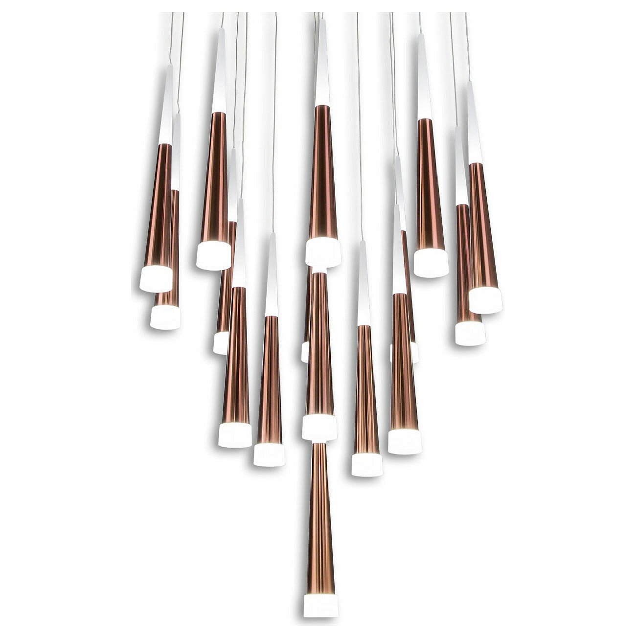 Люстра Вегас – изящный и воздушный предмет интерьера, способный прекрасно справиться с освещением больших по площади помещений. Оригинальные конусообразные плафоны, спускающиеся с потолка на тонких подвесах, образуют эффектную трехуровневую композицию, выглядят эффектно и футуристично. Такой светильник подчеркнет особенности интерьеров, оформленных в стиле авангард или техно. Основные элементы люстры выполнены из металла и полимерного материала, благодаря чему отличаются прочностью и длительным сроком службы.