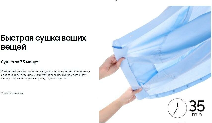 Сушка за 35 минут Ускоренный режим позволяет высушить небольшую загрузку одежды из хлопка и синтетики за 35 минут*. Теперь нее нужно долго ждать, вещи, которые вам нужны - сухие, когда это нужно. Смотри также характеристики.