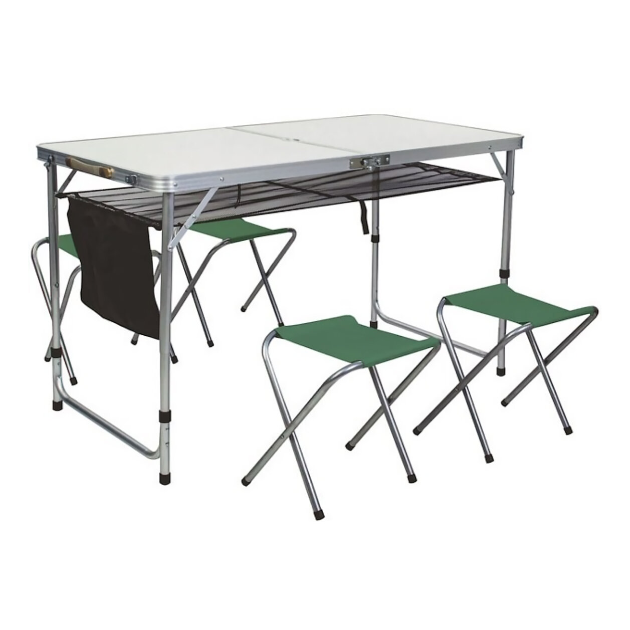 Туристический набор мебели AriZone включает в себя складной стол и четыре табуретки. Стол размером 120×60 см имеет три положения высоты: 53, 60 и 70 см. Он изготовлен из алюминия и МДФ. Табуретки размером 25×30×35 см выполнены из полиэстера 600D. Набор подходит для пикников и загородных поездокПреимущества Складной стол с тремя положениями высоты Удобный карман для мелочей Лёгкий и компактный