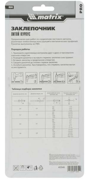 | Прочие особенности и свойства | Ручной литой заклепочник Matrix PRO 40546 длиной 200 мм позволяет скреплять металлические заготовки с помощью вытяжных заклепок диаметром 2,4-3,2-4,0-4,8 мм. Обеспечивает прочность и надежность соединений. Инструмент пригодится как частному мастеру, так и профессионалу при проведении ремонта, установке забора и выполнении других работ., , Преимущества, Долговечность — литой алюминиевый корпус отличается высоким показателем прочности., Эффективная работа — трехсегментный вытяжной цанговый захват из прочной хромомолибденовой стали надежно фиксирует заклепки., Широкие возможности — благодаря дополнительным насадкам можно работать с заклепками различного диаметра., Эргономичность — рукоятки с рельефными накладками из ПВХ и ограничительными упорами не выскальзывают из ладони, а за счет малого веса 528 г заклепочником можно долго работать без усталости., Удобное хранение и транспортировка — конструкцией предусмотрено кольцо-фиксатор, удерживающее рукоятки в закрытом состоянии. |