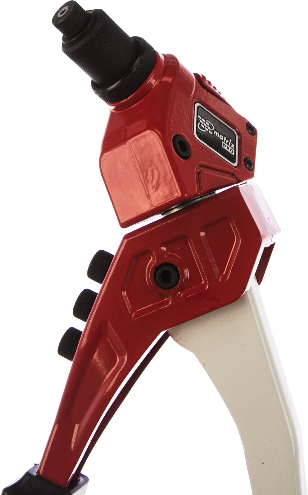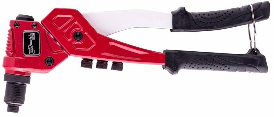 | Прочие особенности и свойства | Литой ручной заклепочник Matrix PRO 40547 длиной 290 мм, поворотный на 0-360°, используется для создания неразъемных соединений с помощью вытяжных заклепок типоразмера 2,4-3,2-4,0-4,8 мм. Голова инструмента вращается на 360°, что упрощает работу в ограниченном пространстве. Заклепочник пригодится на производстве, в ремонтной мастерской, также будет полезен в быту.,,Преимущества,Прочность — литой корпус из алюминиевого сплава устойчив к механическим нагрузкам и выдерживает длительную эксплуатацию.,Надежная конструкция — трехсегментный зажимной механизм изготовлен из высокопрочной хромомолибденовой стали и крепко удерживает вытяжную шпильку заклепки.,Быстрая установка нужной насадки — сменные головки крепятся на корпус, что исключает их утерю.,Комфортная работа — эргономичные рукоятки с рельефной поверхностью удобно ложатся в руку.,Удобное и безопасное хранение и транспортировка — специальный фиксатор удерживает рукоятки в нерабочем положении. |