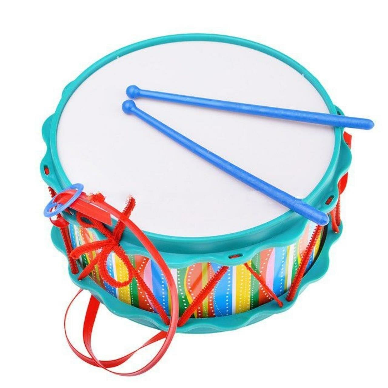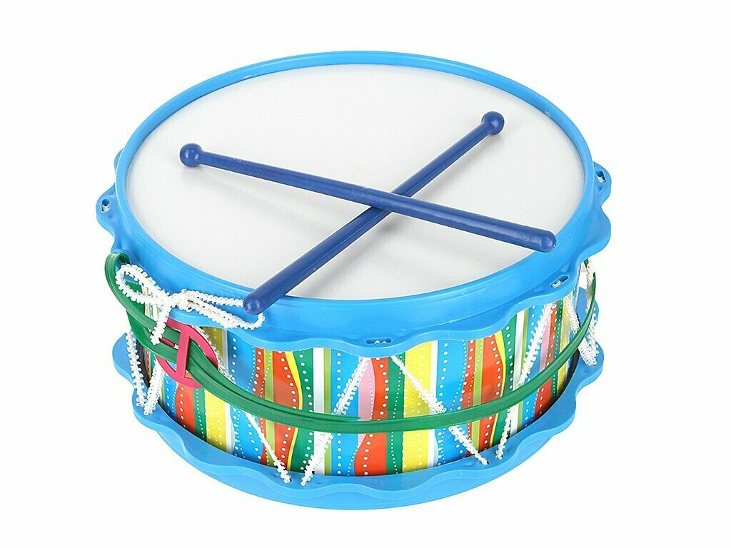 Барабан изготовлен из пластика и раскрашен в яркие насыщенные цвета. Чтобы ребенок смог повесить барабан на шею как настоящий барабанщик, на игрушке есть специальная ленточка. В комплект входят барабанные палочки.