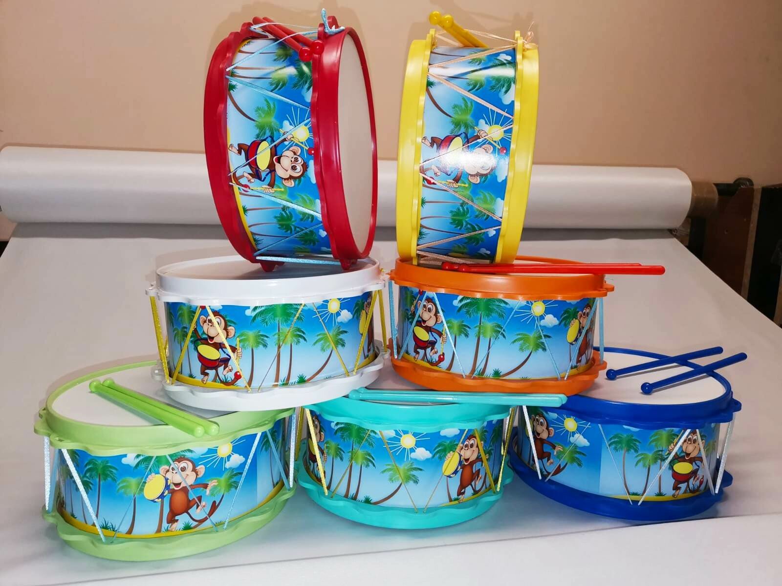 Барабан изготовлен из пластика и раскрашен в яркие насыщенные цвета. Чтобы ребенок смог повесить барабан на шею как настоящий барабанщик, на игрушке есть специальная ленточка. В комплект входят барабанные палочки.
