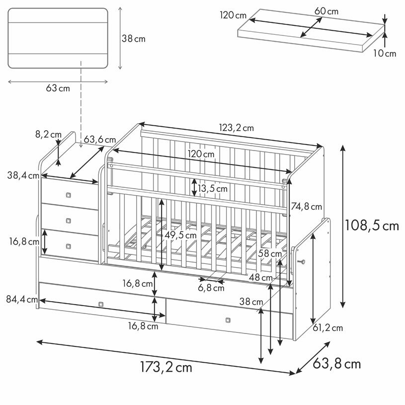 Комод кроватки имеет 3 ящика и пеленальную поверхность с закругленными бортиками по бокам.