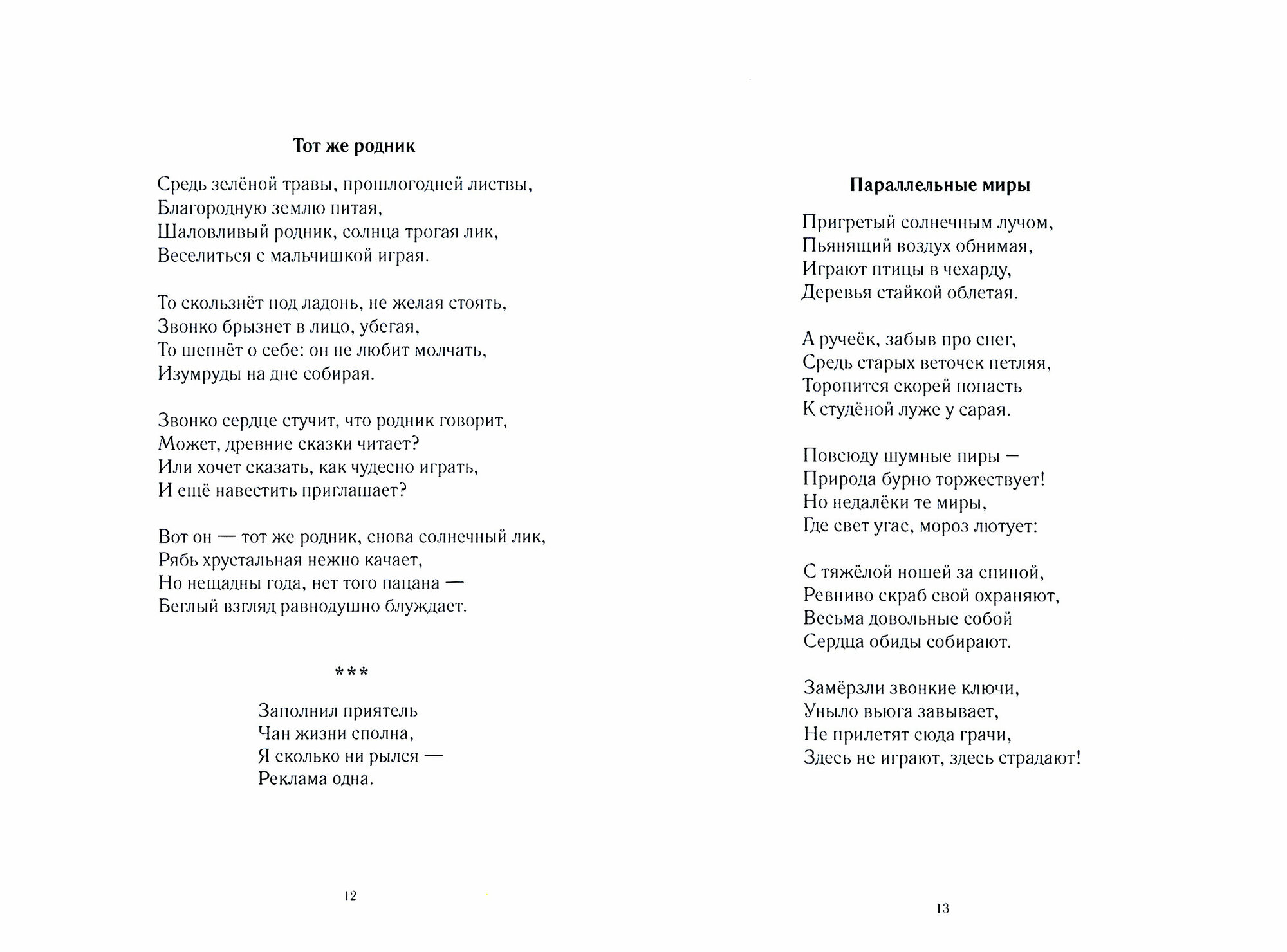 Что есть жизнь? Куда идёт человек и ради чего он живёт? В суете дней мы не так часто задумываемся над этими вопросами. Поэзия же, как всегда, трогает самые тайные струны души и заставляет заглянуть в самого себя. Стихи, собранные в сборнике, не являются исключением. Ёмкие и в то же время лаконичные, они легко и непринуждённо раскрывают читателю то, что в жизни, порой, кажется сложным и неразрешимым. Особенно примечательны стихотворения малой формы. Содержательные и глубокие, а подчас ироничные и даже саркастичные, они, несмотря на свою краткость, поразят читателя богатством мыслей, неожиданными ассоциациями и яркими образами.