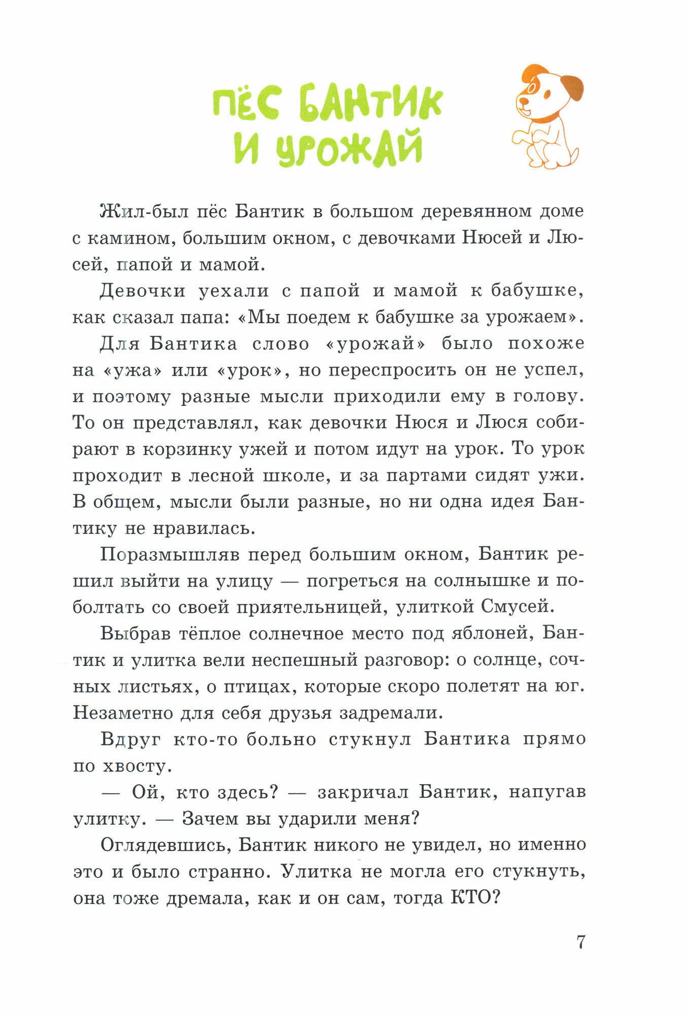 Главный герой книги - симпатичный пёс Бантик, который любит задавать вопросы и узнавать ответы. Он любит совершать открытия, учится дружить, сочувствовать, общаться, помогать, преодолевать трудности и быть смелым, настойчивым и внимательным. Иногда он попадает в трудные ситуации и совершает очень важные подвиги, выручает друзей из беды и, конечно, не забывает о приключениях.