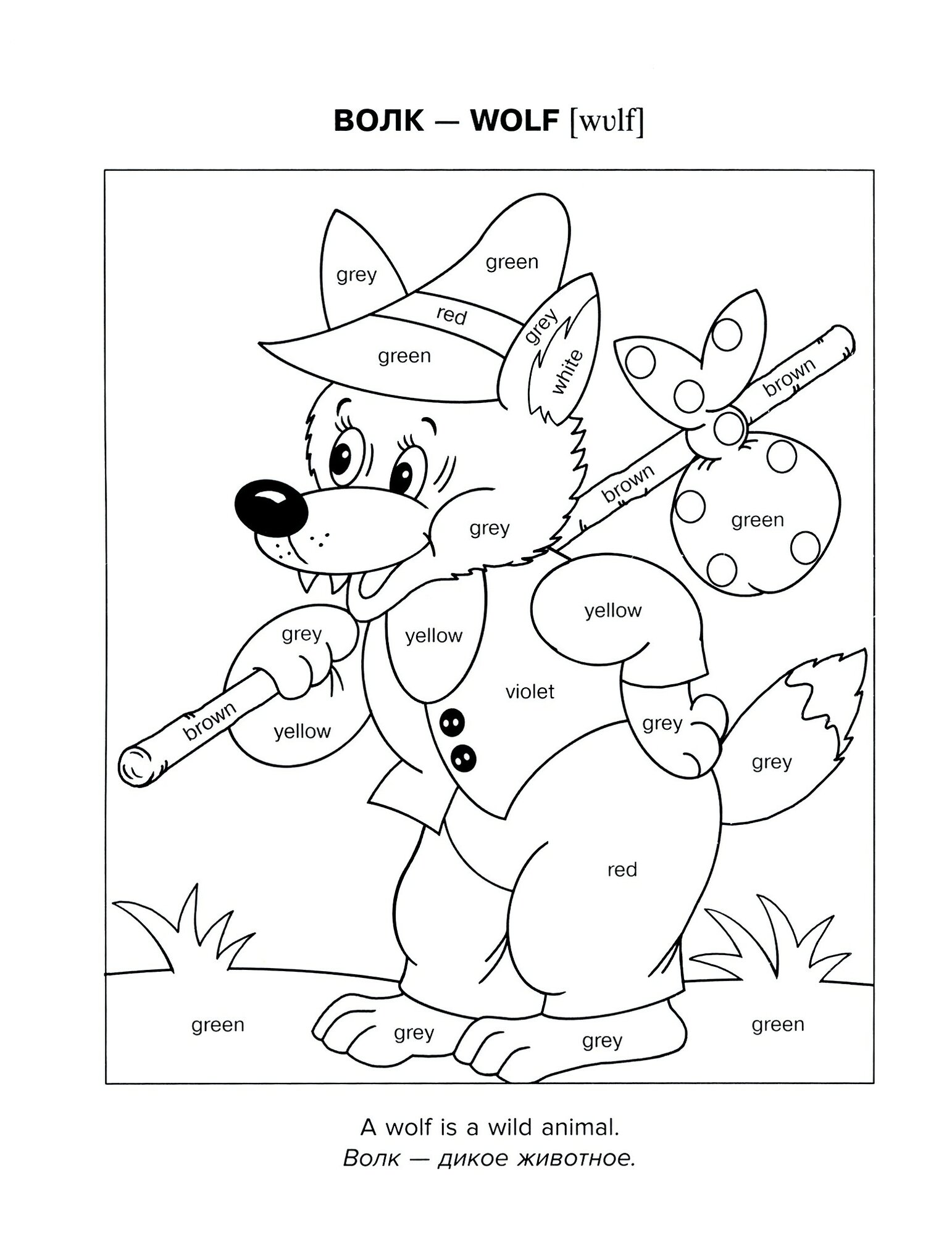 Собственно, в книге только повторение цветов. Как раскраска - отличный вариант! Над каждой картинкой написано, что на ней нарисовано, например: девочка, волк, птица, а под картинкой одна фраза с переводом. Честно говоря, на 2-4 класс не тянет совсем. Но для дошкольников, только начинающих изучать английский - отличный вариант, цвета на зубок выучат ??