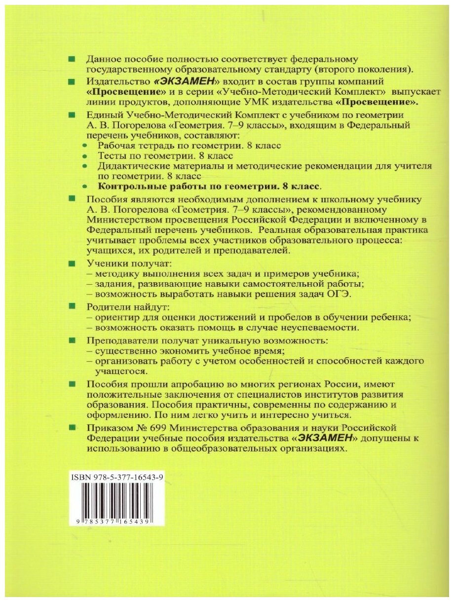Контрольные работы по Геометрии 8 класс К учебнику А. В. Погорелова ФГОС (к новому ФПУ) (Мельникова Наталия Борисовна); Экзамен, 2021