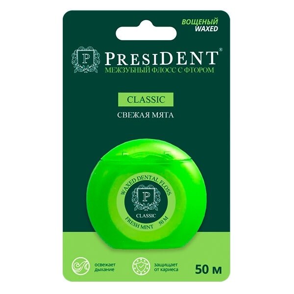 Межзубный флосс (вощеный) с фтором PRESIDENT Classic удаляет остатки пищи и налет между зубами, надолго освежает дыхание, подходит для любых межзубных промежутков. Длина нити 50 метров.
