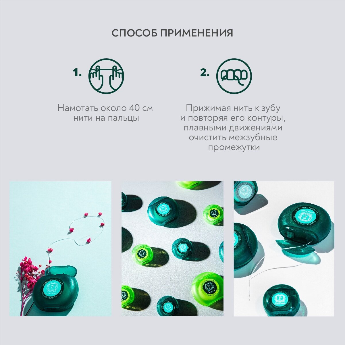| Способ применения | Намотать около 40 см нити на пальцы или специальный держатель для флоссов. Плавными движениями очистить межзубные промежутки. |