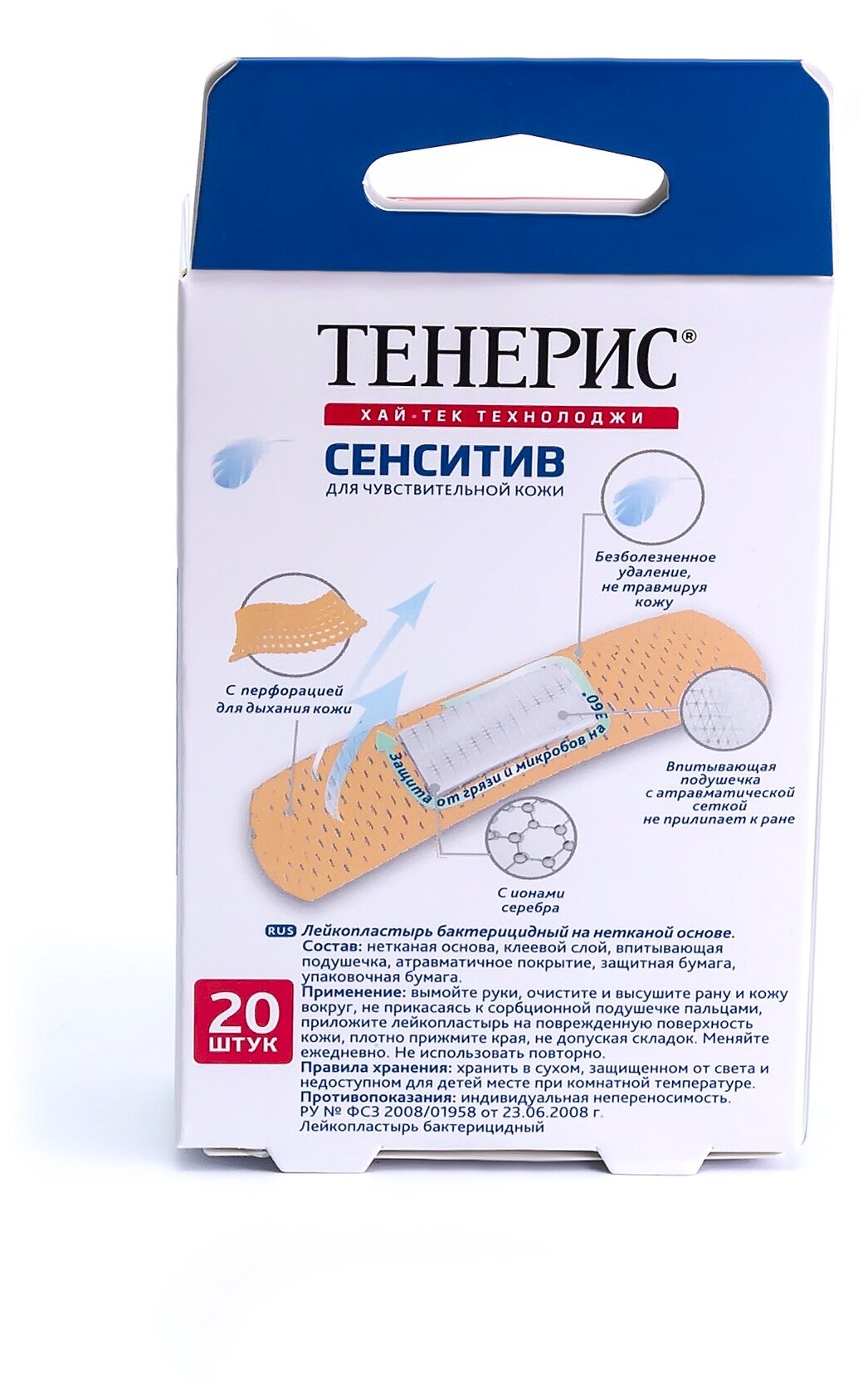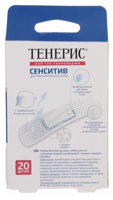 TENERiS Sensitive подходит для применения на особо чувствительных участках кожи, даже таких как лицо и шея:• Благодаря хирургической нетканой основе, ранам обеспечивается антисептическая защита;• Микропористая структура обеспечивает прекрасный воздухообмен для кожи, задерживая при этом пыль и бактерии на своей поверхности;• Впитывающая подушечка с атравматической сеткой не прилипает к ране;• Гипоаллергенный клей надежно фиксирует пластырь, гарантируя при этом безболезненное удаление пластыря без следов на коже;• Стерильны до первого вскрытия.• 20 шт. в упаковке, размер 76 х 19 мм.