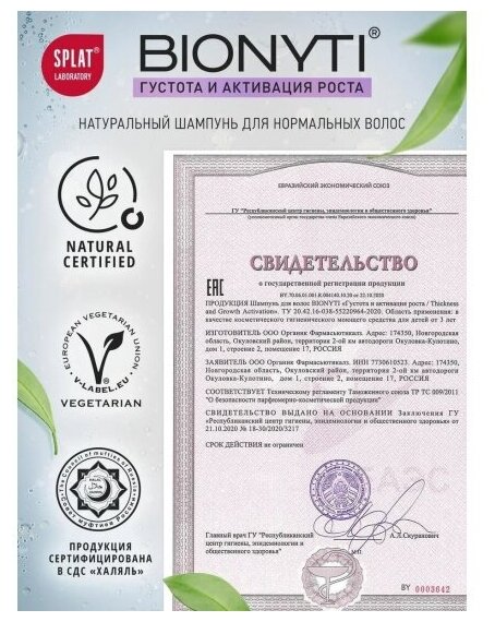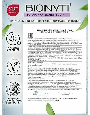 | Состав | вода, цетеариловый спирт, глицерин, октилдодеканол, масло макадамии, масло ши, гидроксиэтилцеллюлоза, бегентримония метосульфат, бегентримониум хлорид, гидроксипропилглюконамид, гидроксипропиламмония глюконат, кватерниум-87, экстракт фукуса, экстракт ламинарии, экстракт ирландского мха, экстракт цистозиры, экстракт хлореллы, экстракт кермека широколистного, бетаин, изопропиловый спирт, кватернизованные гидролизованные протеины пшеницы, фильтрат фермента гриба рейши, цетримониум хлорид, оливковое масло, подсолнечное масло, эфирное масло лаванды, экстракт лаванды, эфирное масло тимьяна, эфирное масло корицы, экстракт корицы, эфирное масло можжевельника, эфирное масло базилика, экстракт базилика, эфирное масло черного перца, эфирное масло ладана, эфирное масло апельсина, винная кислота, молочная кислота, экстракт корня бадана, лизат пропионовокислых бактерий, глюконат меди, глюконат цинка, аспартат магния, глютамат диацетат тетранатрия, пироглутамат натрия, лактат натрия, аргинин, аспарагиновая кислота, пироглутамовая кислота, глицин, аланин, серин, валин, треонин, пролин, изолейцин, гистидин, фенилаланин, аскорбил пальмитат, токоферол, ксантофиллы, камфора, эвкалиптол, отдушка, дегидроуксусная кислота, феноксиэтанол, бутилен гликоль, сорбат калия, бензоат натрия, бензиловый спирт, бензойная кислота, пентилен гликоль, лимонная кислота, лимонен, эвгенол, natural origin |