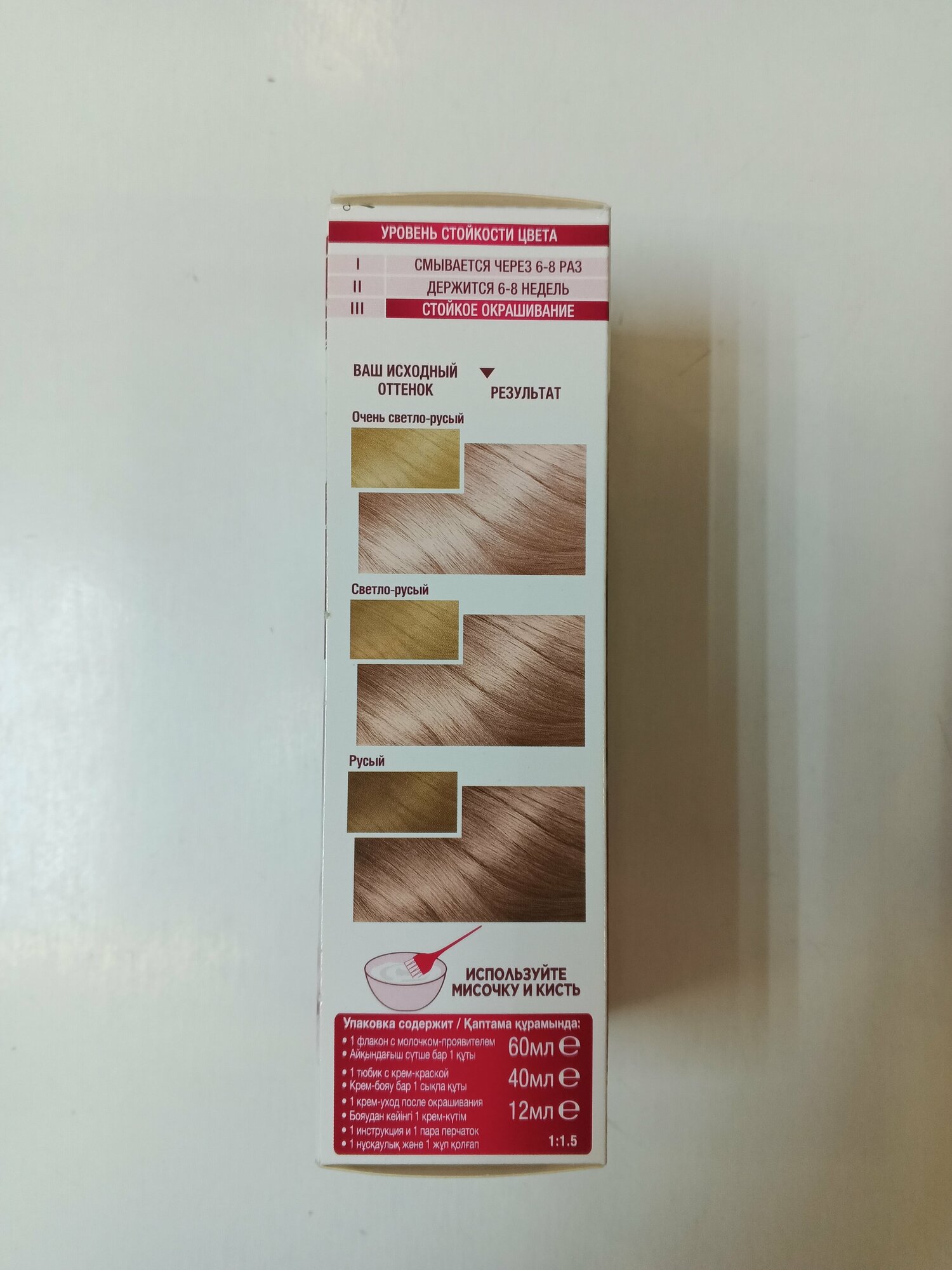 | Комплектация | Флакон с молочком-проявителем (60 мл); Тюбик с обесцвечивающим кремом (40 мл); Крем-уход после окрашивания (10 мл); Инструкция; Пара перчаток |