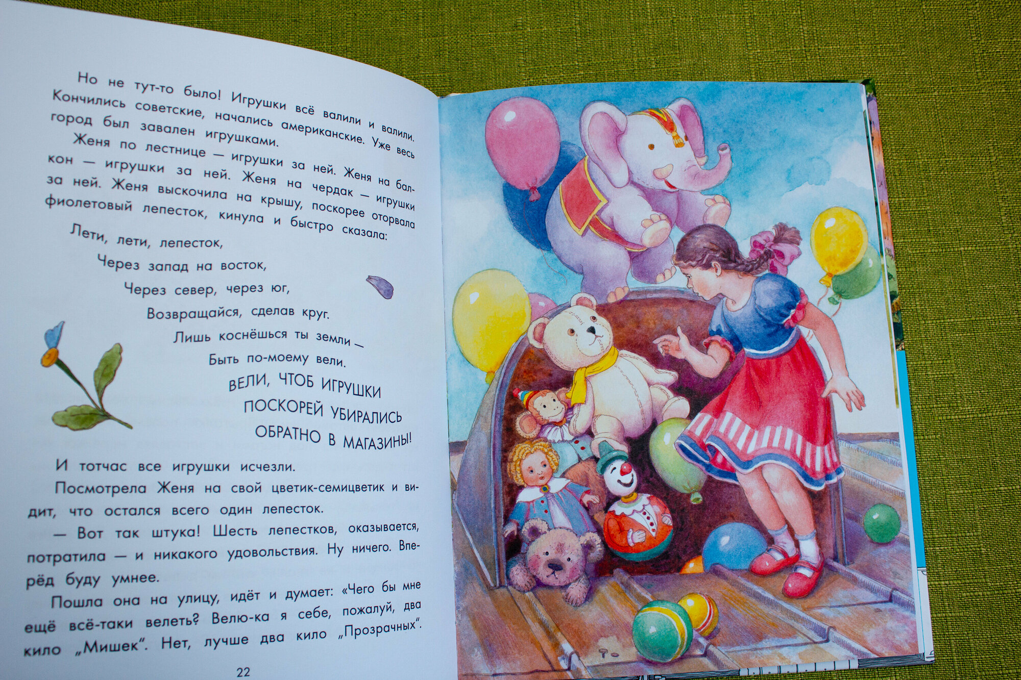 Сказки В.Катаева купила в подарок внучке. Очень довольна покупке! Книга прекрасно оформлена, толстый переплёт, красочные реальные иллюстрации. Ребенок учится читать, надеюсь, ей понравится. Жаль, что таких хороших и поучительных книг не было, когда подрастали мои сыновья.