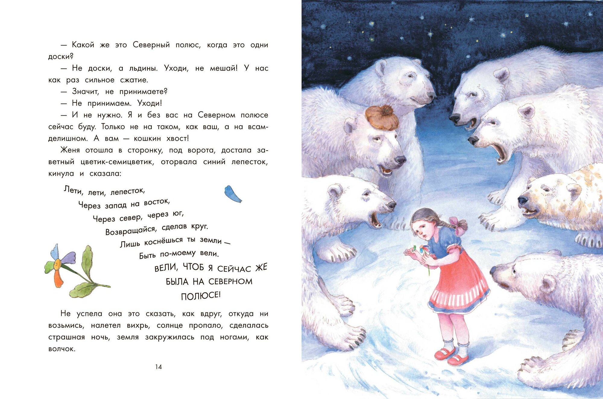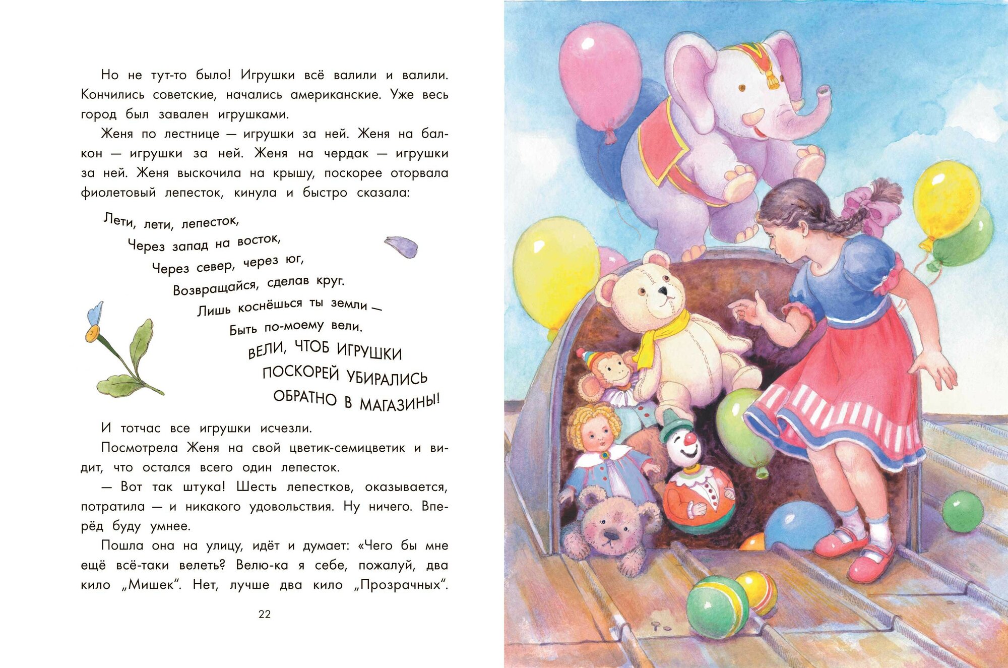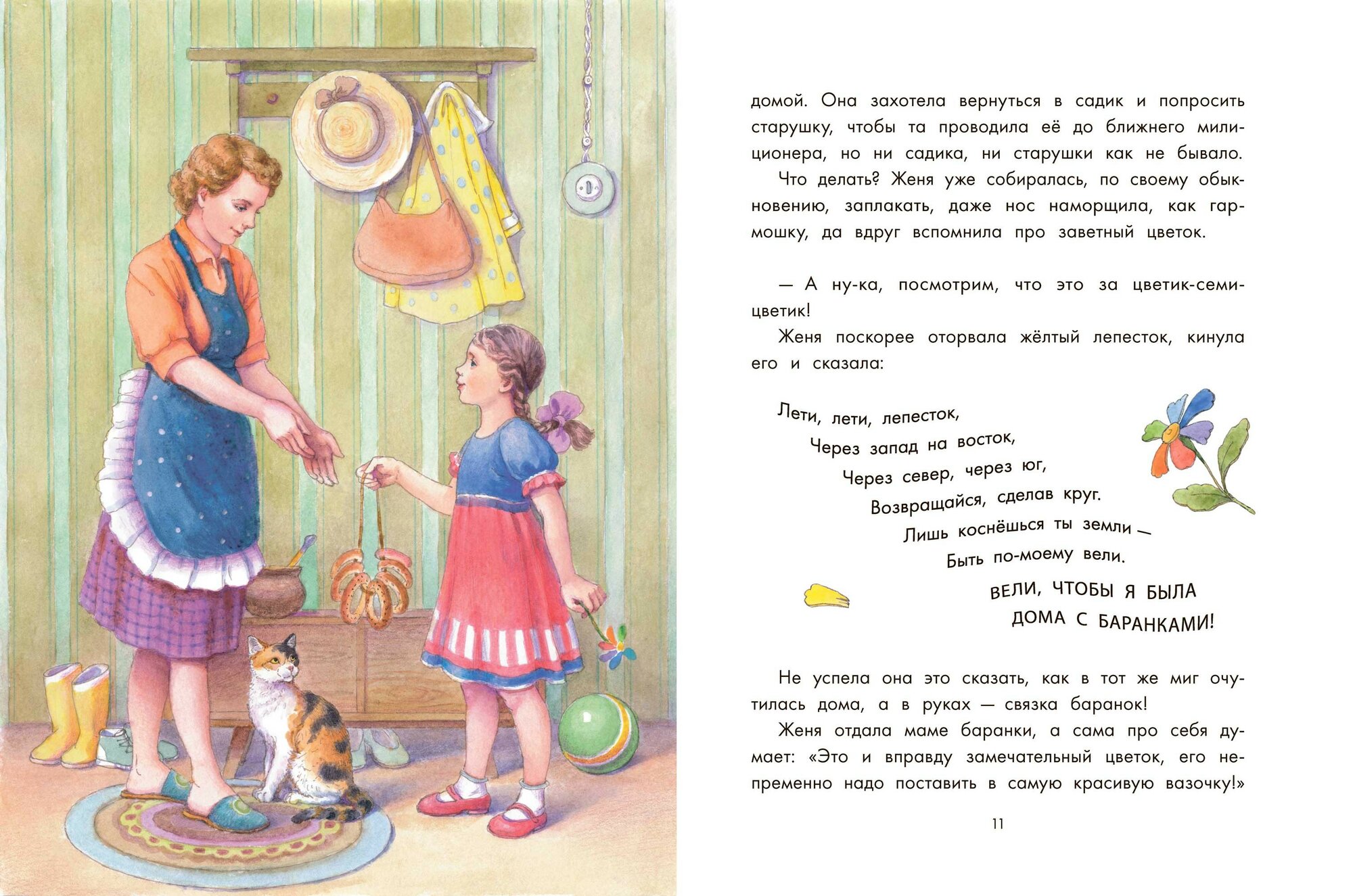 Если бы Женя не считала ворон, она бы заметила, что бродячая собака съела все её баранки. Теперь мама, папа и брат Павлик останутся без угощения, и слезами горю не помочь. Но тут Жене помогло волшебство: незнакомая старушка подарила ей цветик-семицветик - чудесный цветок, исполняющий желания. Только на хорошие ли дела потратила волшебную силу героиня "Цветика- семицветика"? Научиться отличать важное от второстепенного и принимать верные решения придётся и героям других сказок Катаева: "Дудочка и кувшинчик", "Грибы", "Пень", "Голубок". В этом им помогут сказочные существа, а ещё родители, которые всегда готовы понять и поддержать своих детей.