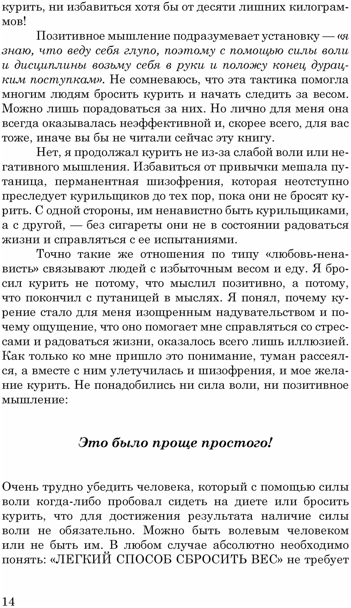 Прочитала очередную книгу этого автора, когда столкнулась с определёнными проблемами с весом. Эта книга несколько отличается от "легкого способа бросить курить". В ней помимо информаци о вреде переедания и описаний "плохих" продуктов, есть еще и очень много полезной информации в принципе для здорового питания. Я очень много узнала о конкретных продуктах, о которых раньше даже не задумывалась. Сейчас же они включены в рацион и дело потихоньку идет в лучшую сторону. Автор с фантастической легкостью описывает вашу проблему и решает ее. Очень благодарна этому автору за его труд!