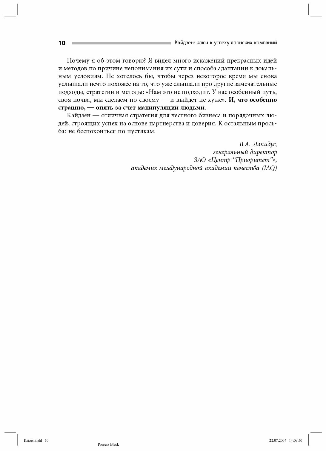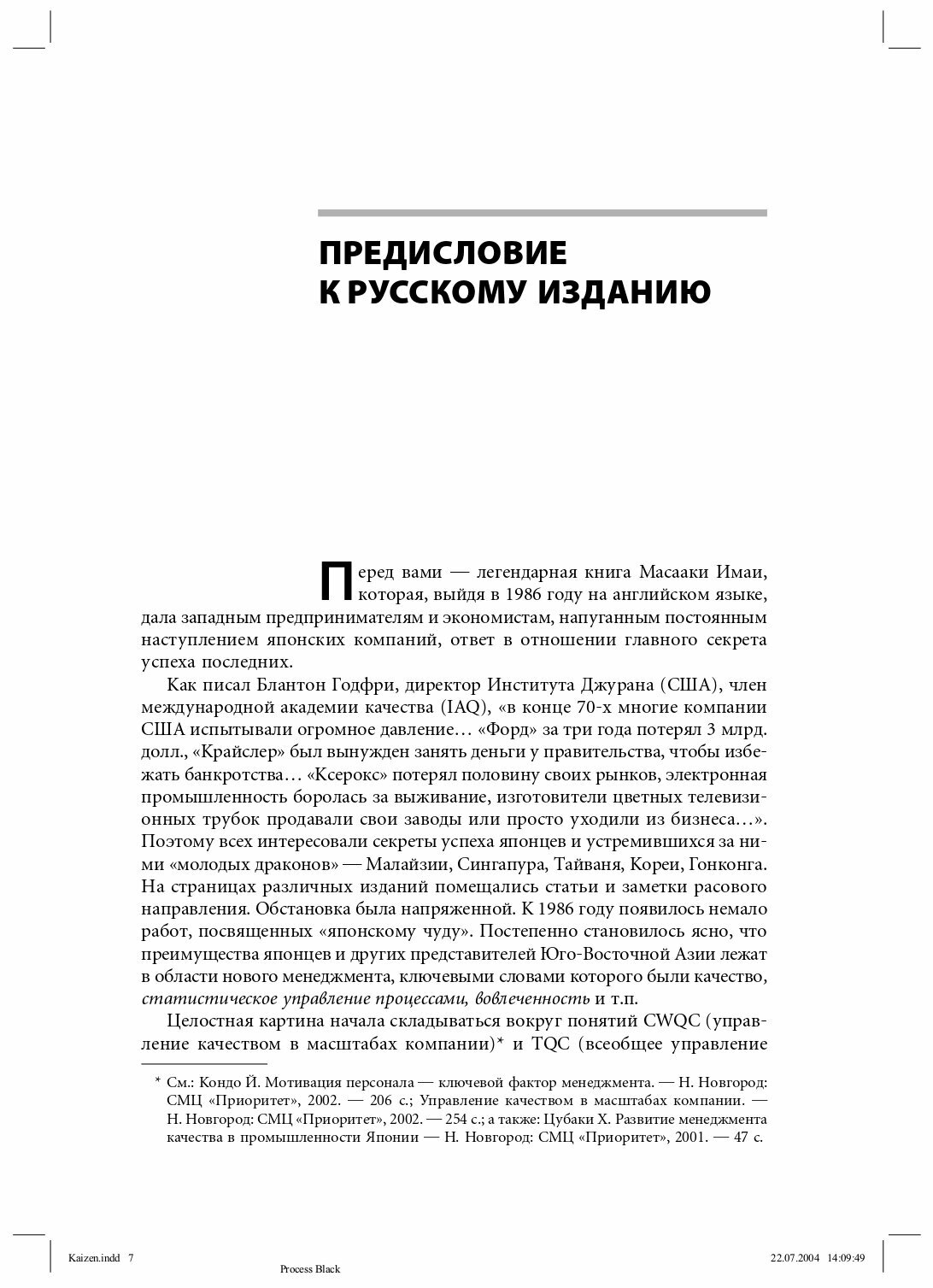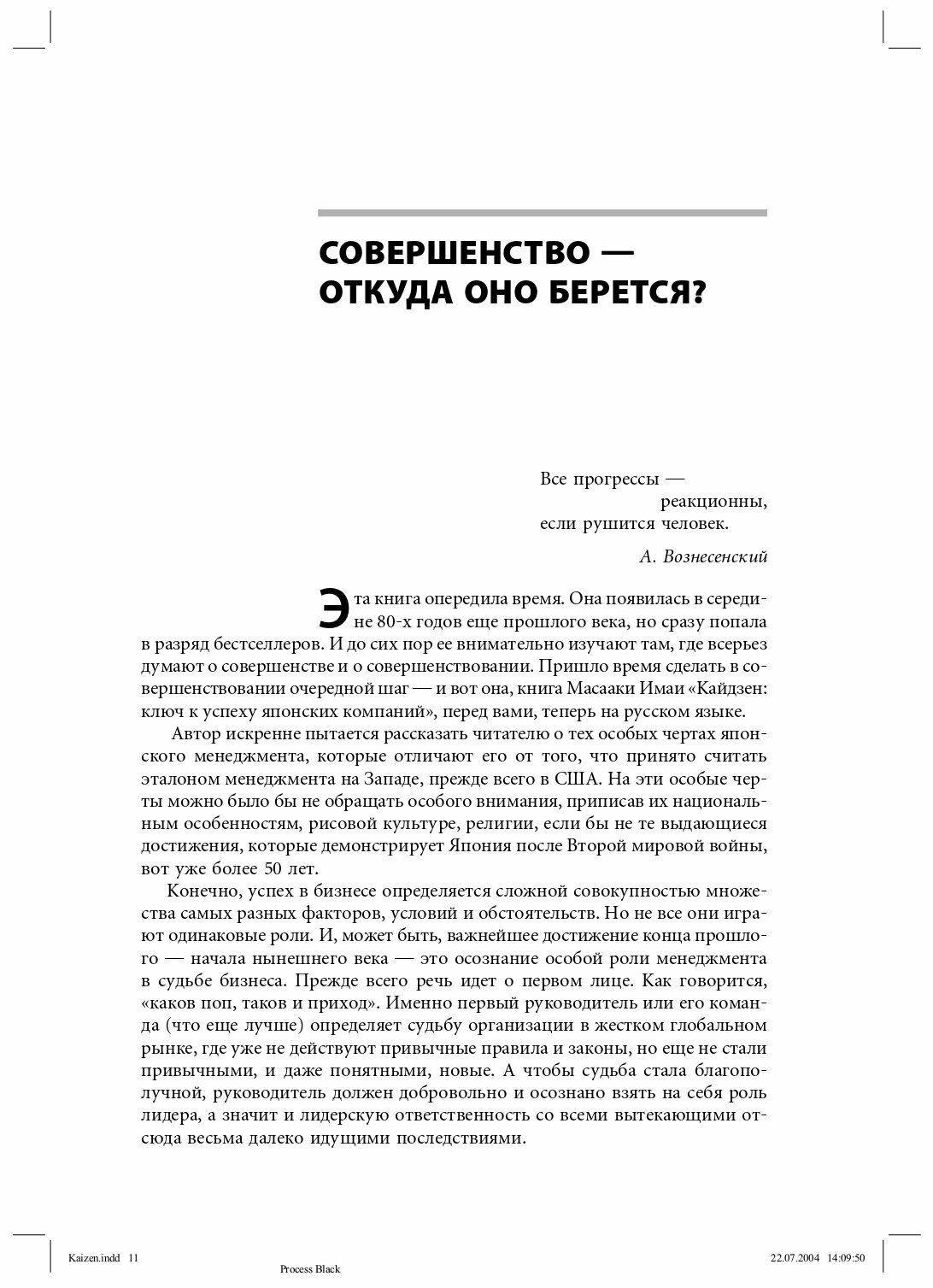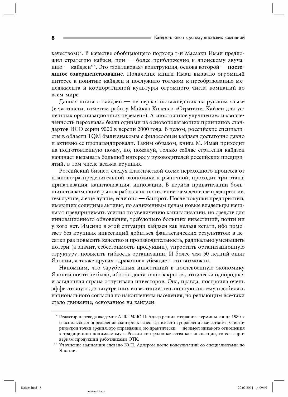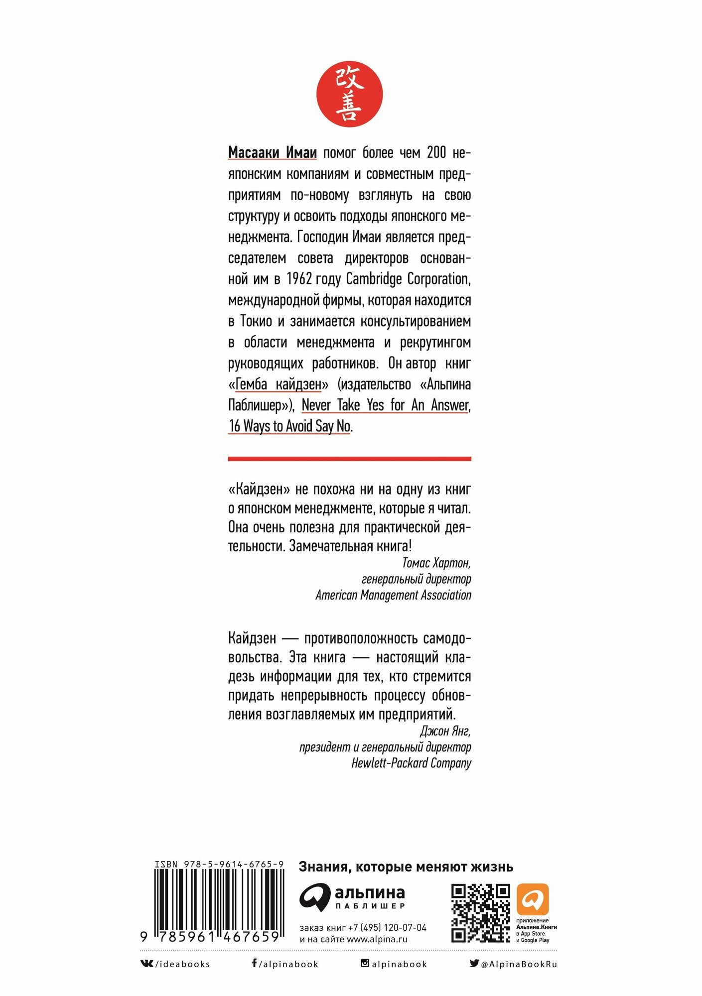 Эта книга — первоисточник. Ее автор, М. Имаи, именно здесь впервые ввел термин «кайдзен» и призвал читателей за пределами Японии обратить внимание на огромные возможности менеджмента по-японски.
