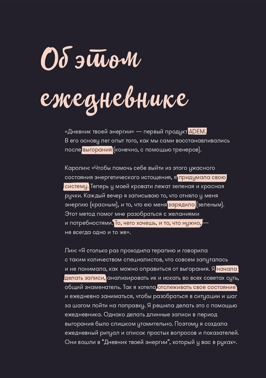 Теперь у меня в коллекции есть такой невероятный красавчик! ⠀ Авторы, пережившие, периоды выгорания на собственном опыте, создали свой дневник, на который Вы будете затрачивать не более 10 минут в день. ⠀ Суть ежедневника такова, что в конце каждого дня Вы делаете записи, отмечаете какие события отняли у Вас больше всего энергии, а какие наоборот восполнили ее баланс, что подняло настроение, а что огорчило. ⠀ Изо дня в день Вы сможете отслеживать своё физическое, эмоциональное, социальное, психологическое, финансовое и духовное состояние. ⠀ Научитесь быть благодарны каждому дню и ставить цели на последующие дни. ⠀ Этот дневник, хороший помощник для тех, кто не может разобраться в себе, понять, почему у него вечно нет сил, и как это изменить. Для всех, кто выгорает на работе и дома, и хотел бы стать более жизнерадостным и энергичным по жизни. ⠀ В дневнике большое количество мотивирующих цитат и картинок, которые невероятно поднимают настроение. ⠀ Также безумно понравилось красивое, лаконичное оформление, нет ничего лишнего, все по делу. И конечно же качественная плотная бумага, которая выдержит даже маркеры. ⠀ Я очень довольна своим новым дневником, он помогает мне в наблюдениях за тем, что угнетает меня, а что наоборот поднимает дух. А это я считаю очень важный аспект бытия!)
