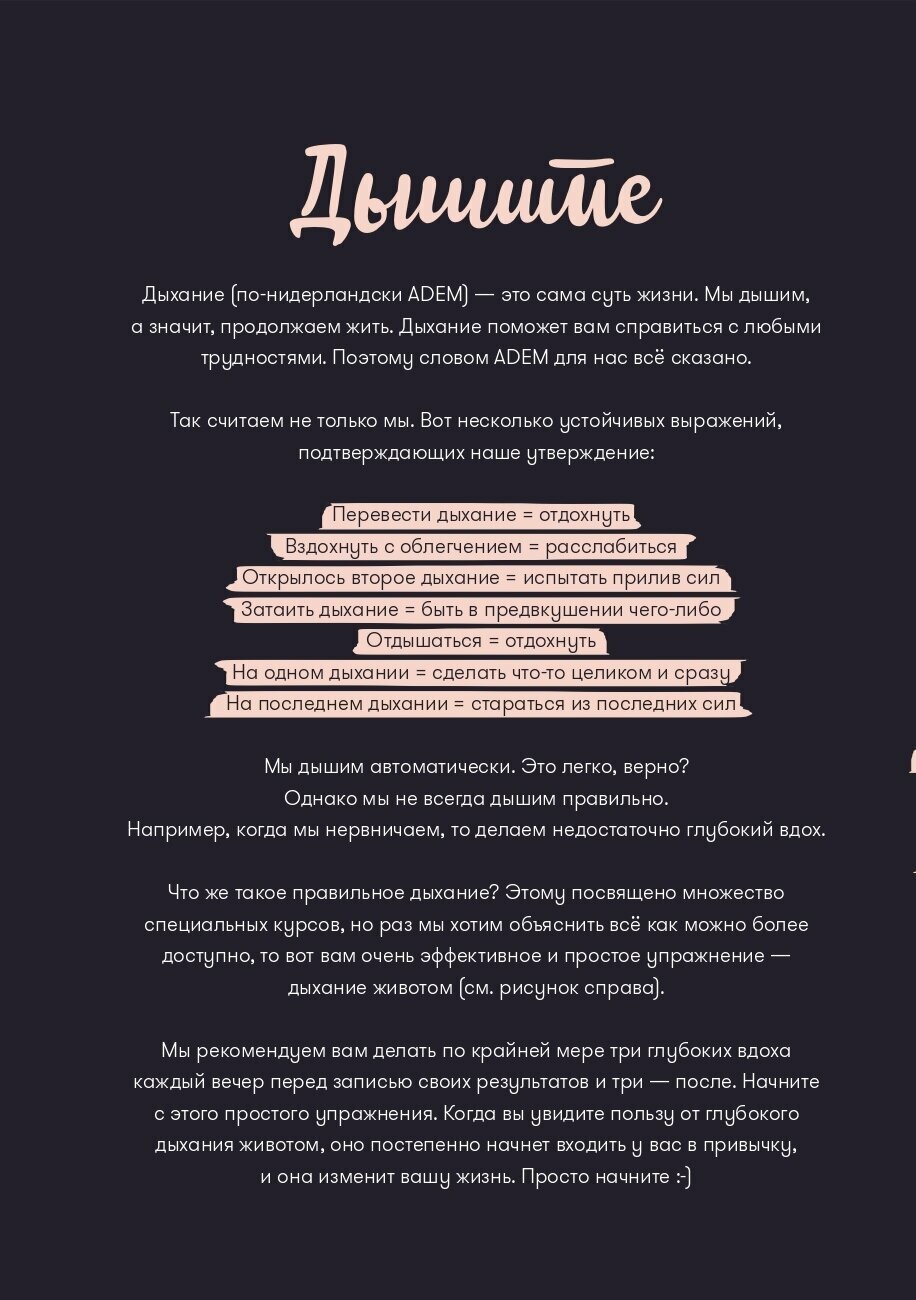 Этот ежедневник поможет вам восстановить баланс вашей позитивной энергии, понять, что для вас является ее источниками, а что лишает сил. Лин Адамс и Каролин Эммерс разработали несложные действенные ритуалы, выполнять которые просто и приятно.Авторы не только дают советы, но и делятся с вами мотивирующими высказываниями известных людей о том, как подправить жизненные установки и обрести баланс. Уделяя ведению дневника всего 10 минут в день, вы научитесь анализировать всё, что с вами происходит, лучше распределять время, быстрее справляться с трудностями и сложными задачами, лучше понимать себя, всегда быть в хорошем настроении и гармонии с собой.