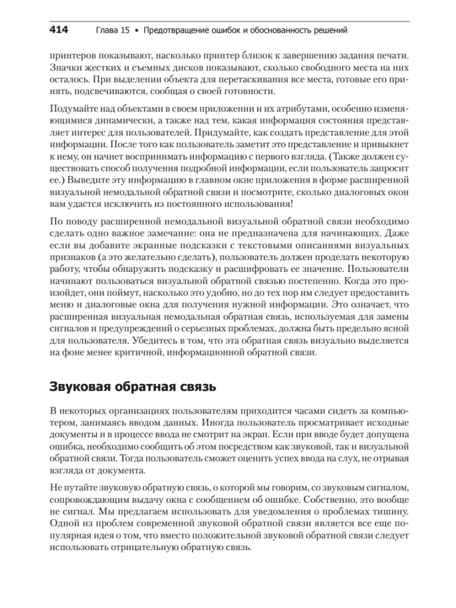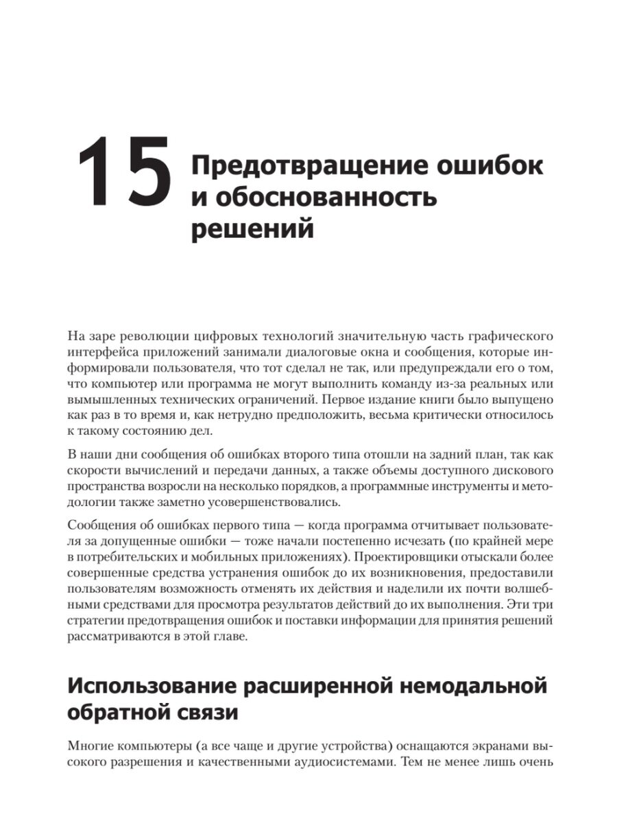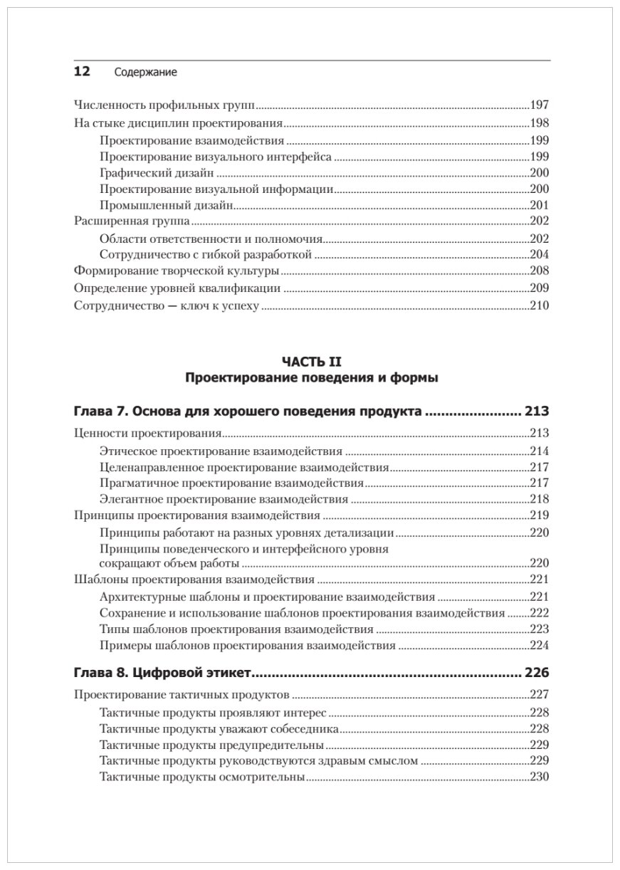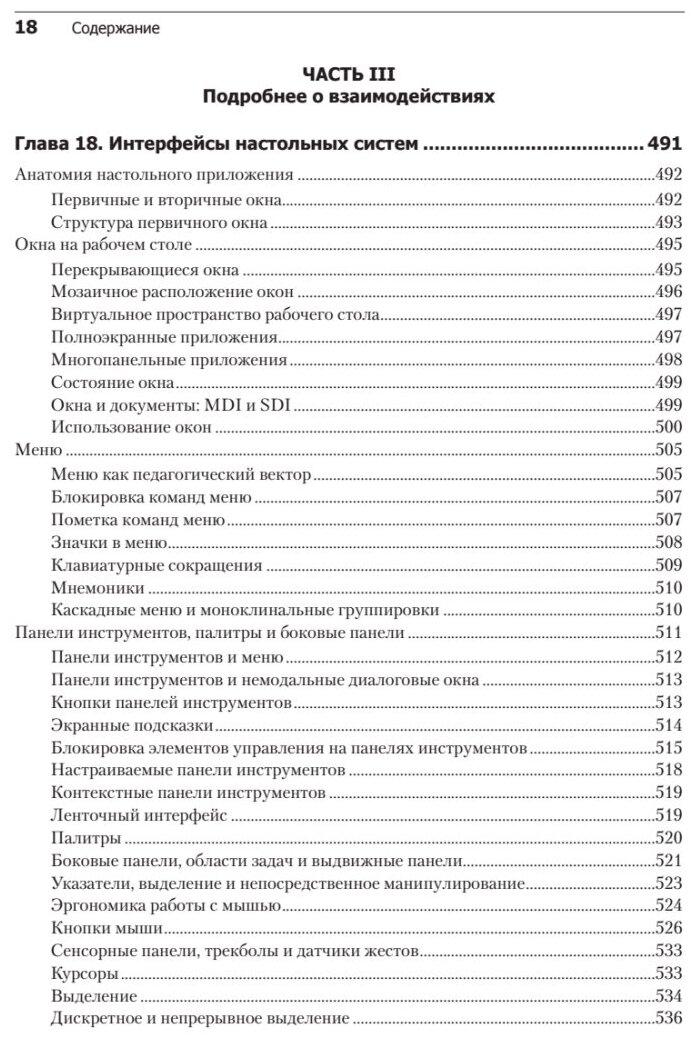 В каждой главе представлена уникальная информация, посвящённая определённой теме. Часто можно заметить повторы одной и той же мысли или одних и тех же структур как в рамках главы, так и в рамках целого раздела. С одной стороны, это способствует лучшему запоминанию ключевых моментов, а также предоставляет исчерпывающую информацию тем, кто не читает книгу сплошь, а лишь знакомится с отдельными частями, освежая знания или консультируясь по узкому вопросу. С другой стороны, это может показаться назойливым и заставляет читателя чувствовать себя тем, кому надо много раз повторять и объяснять простые вещи. После прочтения книги вы не только будете знакомы с основными понятиями и принципами проектирования интерфейсов, но и на зубок будете знать замечательную цитату Сент-Экзюпери, которая здесь приведена аж три раза (если не больше) 😄