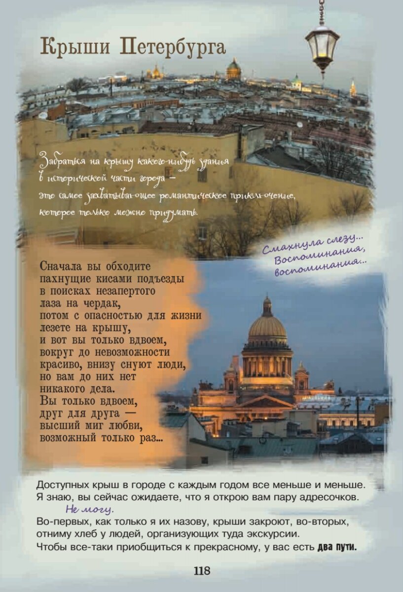 Я пару месяцев назад была в Петербурге и почти все места описанные в данном путеводителе, посетила. А те, что не посетила, обязательно посещу в следующий раз. Из книги узнала некоторые новые, интересные факты. Язык живой и с юмором. Читается легко и быстро. Прочитала за один день, в общей сложности за несколько часов. Много фото и дизайн книги отличный, страницы плотные и самое издание легкое, его удобно брать с собой в дорогу.