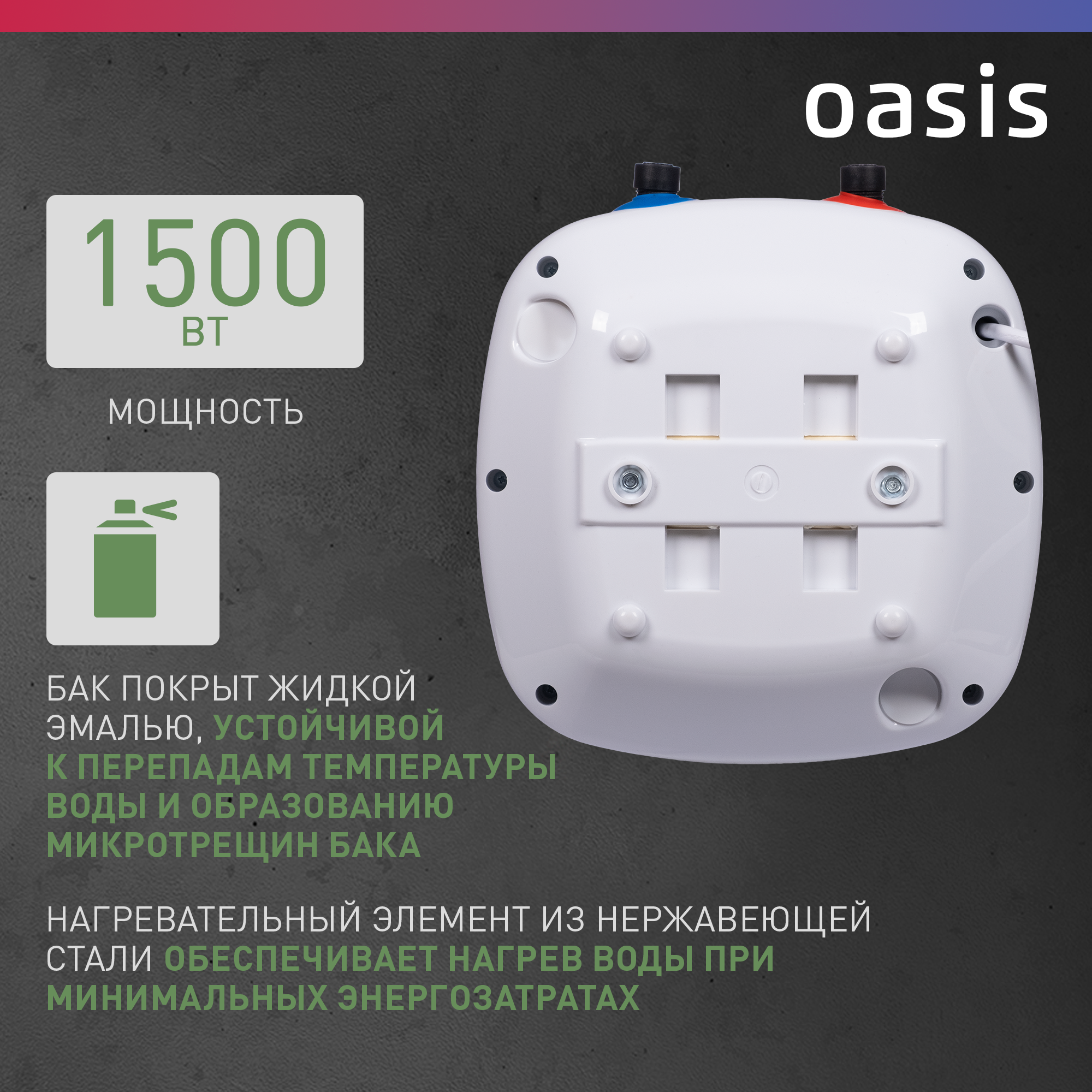 Водонагреватель Oasis с объемом 6 литров обладает компактными размерами, сдержанным дизайном и высокой эффективностью. В его конструкции установлен трубчатый нагревательный элемент с мощностью 1.5 кВт, способный эффективно нагревать воду до температуры 75 °C. Регулируемый механический переключатель позволяет легко контролировать интенсивность нагрева. Двойная антикоррозийная защита увеличивает срок службы накопительного водонагревателя Oasis . Предохранительный клапан помогает устройству избавиться от излишнего давления. Среди других выдающихся характеристик следует отметить технологию защиты от перегрева. Для удобной установки в комплект входят необходимые крепежные элементы. Тип водонагревателя: накопительный; Способ нагрева: электрический; Установка: настенная (под мойкой); Способ установки: вертикальная; Управление: механическое; Напряжение сети: 220 В; Нагревательный элемент: трубчатый; Потребляемая мощность: 1500 Вт;