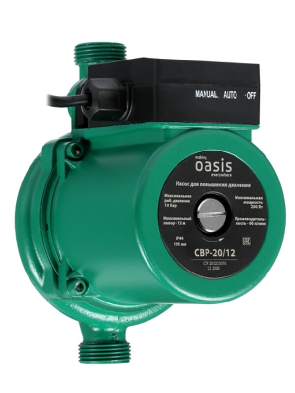 Прибор с трубным соединением 2 см обладает пропускной способностью 3.6 м³/ч, благодаря чему достигает производительности 60 л/мин при создании напора до 12 метров. Насос с прочным чугунным корпусом и защитой IP44 поставляется с двумя резиновыми прокладками для герметизации системы и двумя сгонами с накидными гайками.