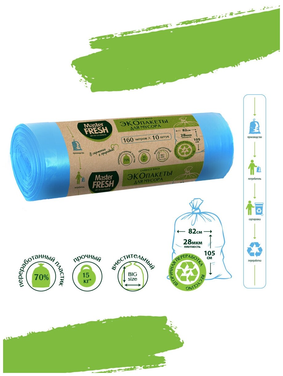 Прочные эко-пакеты для мусора Master Fresh на 70% производятся из вторичного переработанного сырья. Подлежат последующей переработке. Таким образом, сокращается вред, наносимый окружающей среде. Повышенная плотность эко-пакетов Master Fresh позволяет выдерживать нагрузку до 35кг! Практичные и удобные в применении эко-пакеты мягкие на ощупь, из всей линейки пакетов для мусора их выделяет небесно-голубой цвет. Оптимальный размер пакетов идеально подходит для ведра объемом 70 л.