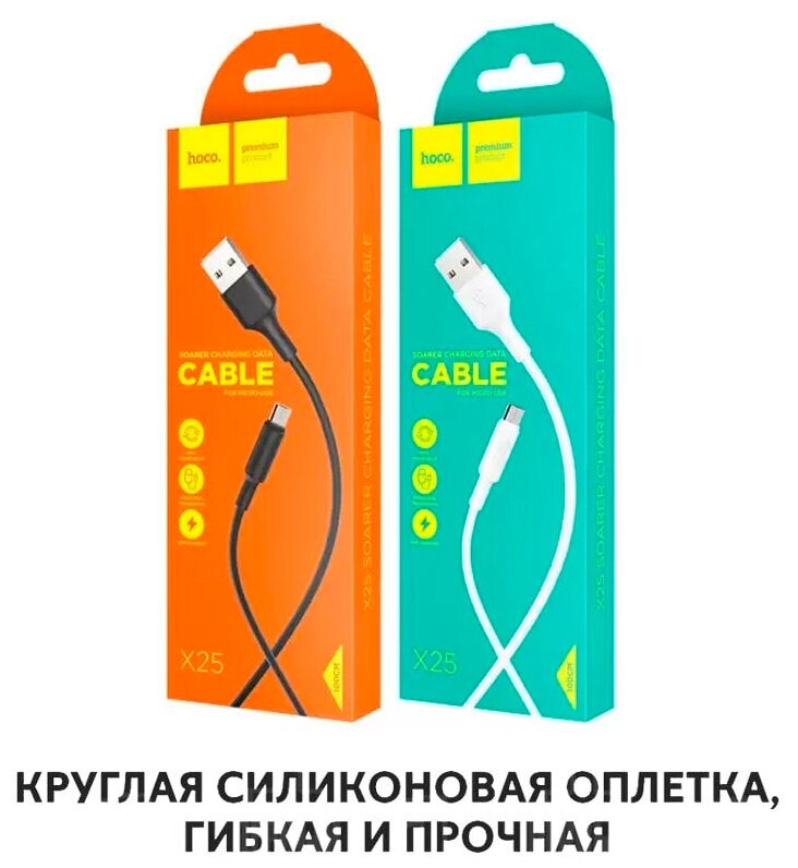Кабель USB - Micro USB HOCO X25, Soarer. Изготовлен из высококачественного материала, устойчив к изгибам и долговечен. Материал кабеля: медь, алюминиевый сплав и высококачественный силикон. Кабель поддерживает быструю зарядку и служит как DATA кабель. Кабель укомплектован в стильной брендовой упаковке. Корпус разъемов усилен металлической пластиной и весьма практичен в повседневном использовании. Предназначение: предназначен для передачи данных и подзарядки цифровых устройств. Особенности: кабель круглый, поддержка быстрой зарядки 2 А (max). Длина кабеля 1 м.