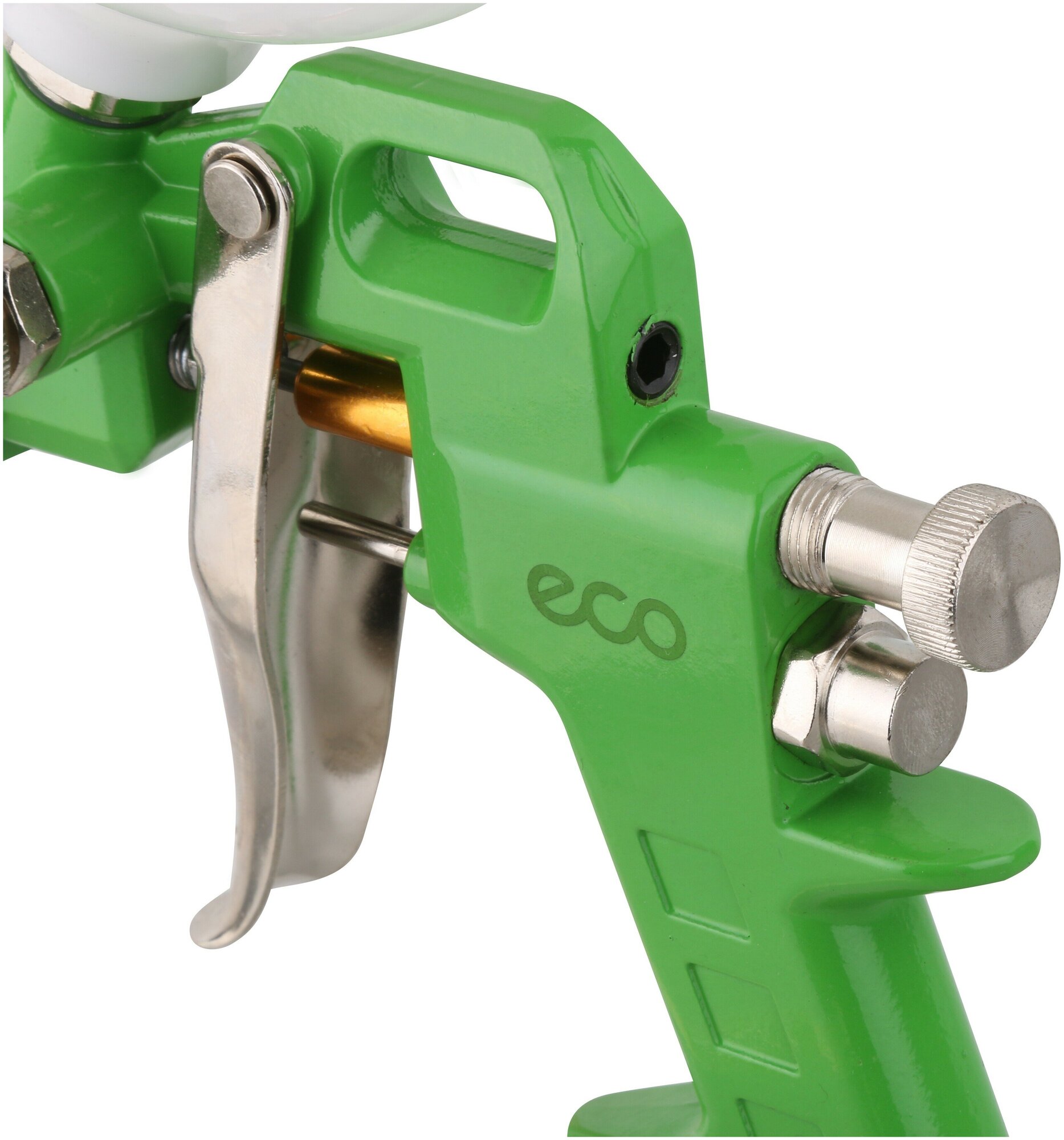 Краскораспылитель ECO - это базовый универсальный краскораспылитель типа HVLP, который подойдёт для выполнения широкого ряда бытовых покрасочных работПреимущества Высокая экономия материалов Практически отсутствие опыла Нет завихрений - нет мусора Верхний пластиковый бак 600 мл Регулировка подачи материала Сопло 1.5 мм Легкий вес Быстросъемное соединение