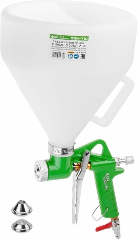 Краскораспылитель ECO предназначен для нанесения декоративной (в т.ч. мраморной) штукатурки; огнезащитной декоративно-гидроизоляционной штукатурки; шпаклевочных масс, фасадных красок и жидких обоев, пробковых покрытий, огнеупорных и защитных материалов, жидких утеплителей, различных материалов, которые используются при текстурной отделке.Преимущества Высокая экономия материалов Большой бак для распыляемого материала Конструкция распылителя предусматривает постоянное прохождение воздуха через сопло, даже при отпущенном курке, для того, что бы материал не засыхал В комплекте 3 сопла различного диаметра