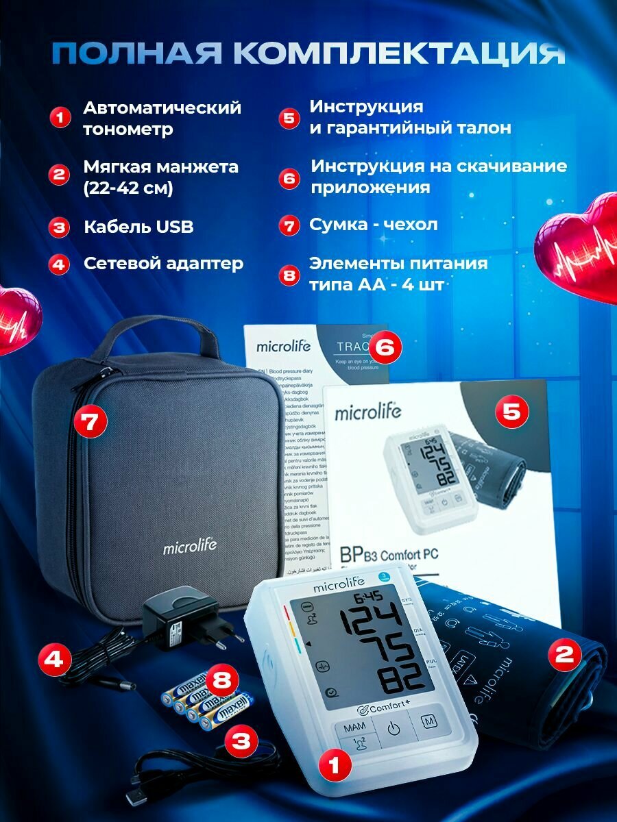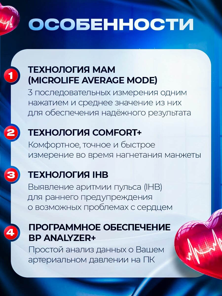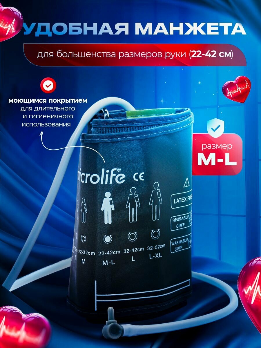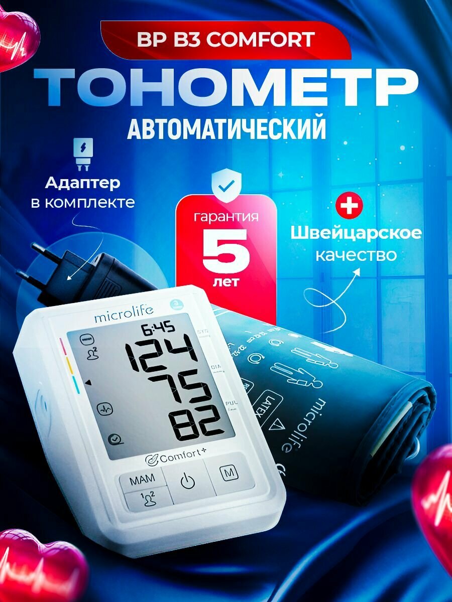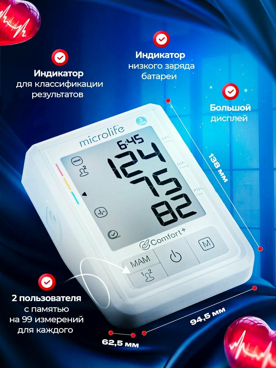 Этот невероятно удобный прибор, автоматический тонометр, произведет измерение давления быстро и с высокой точностью. Электронный аппарат предназначен для медицинского и домашнего использования. С помощью этого умного измерителя можно быстро и без лишних усилий измерить давление самостоятельно. Технология Comfort + для измерения во время нагнетания манжеты. Индикатор для классификации результатов («Светофор»). 2 пользователя с памятью на 99 измерений для каждого. Проверка посадки манжеты. Настраиваемые дата и время. Простой анализ данных о Вашем артериальном давлении на ПК. Кабель Micro-USB входит в комплект. Комплект включает в себя автоматический тонометр, который оснащен манжетой для комфортного использования, подойдет людям с обхватом плеча 22-42см. К тому же, в комплекте имеется адаптер для питания от электросети, что обеспечивает постоянную работу прибора без необходимости частой замены батареек. Прибор также может работать от батареек. Благодаря этому замечательному медицинскому прибору каждый может легко и точно измерить свое давление в любое удобное время. Швейцарское качество бренда Microlife отличает этот прибор надежностью и удобством в использовании.