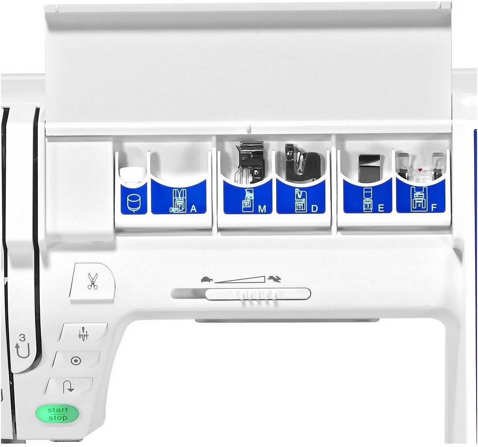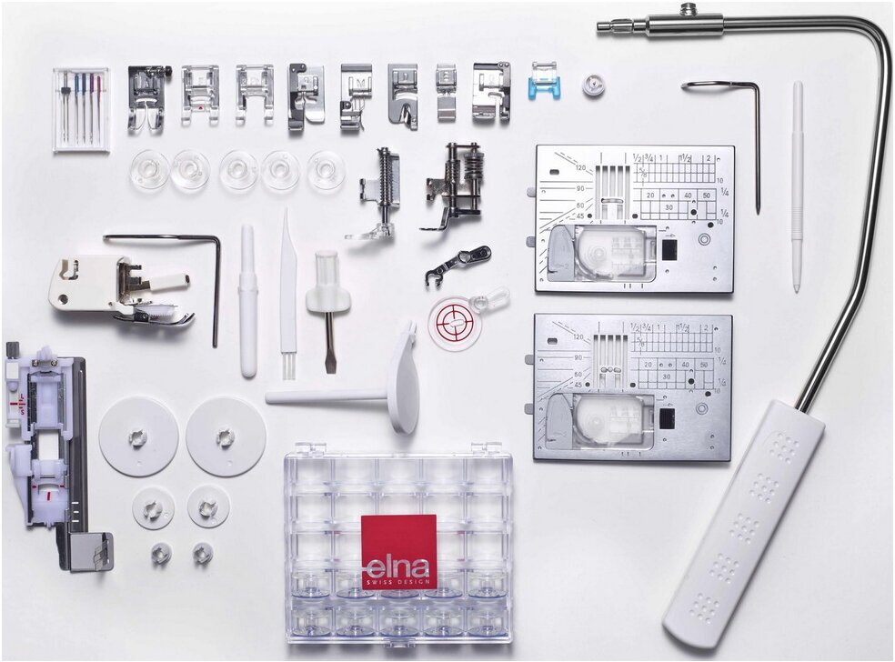 | Комплект поставки | Вспарыватель; Двойная игла; Дискообразная отвёртка; Дополнительный катушечный стержень; Жесткий чехол; Краеобмёточная лапка; Краткий справочник; Лапка для вшивания молнии; Лапка для вышивания монограмм; Лапка для обмётывания петель; Лапка для потайной строчки; Лапка для пришивания пуговиц; Лапка для строчки зигзаг; Набор игл; Отвёртка (большая, малая); Педаль; Прошивка; Руководство пользователя; Щёточка для очистки; Коленный рычаг; Верхний транспортер |