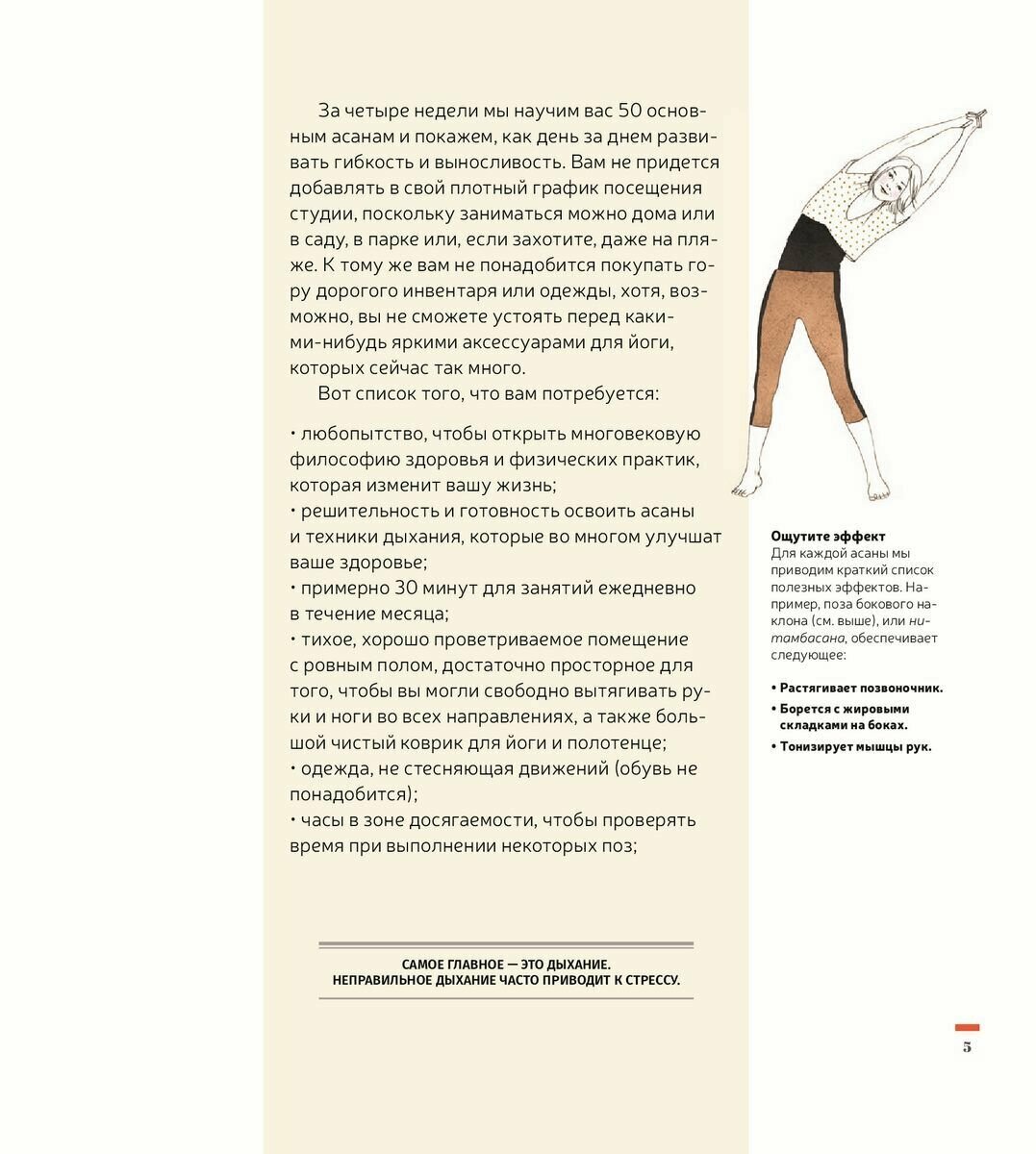 Вам нравится йога, но вы не знаете, с чего начать? Сбиты с толку множеством книг и сайтов, демонстрирующих разные позы, но не объясняющих, как их соединить в комплекс? Значит, эта книга для вас. С ее помощью вы пройдете 30-дневный курс занятий, начав с простейших упражнений и постепенно их усложняя. Даже если вы не слишком спортивны и никогда раньше не занимались йогой, то почему бы не попробовать? Всего за месяц вы освоите 50 базовых асан, которые придадут вам силы, гибкости, бодрости и здоровья.