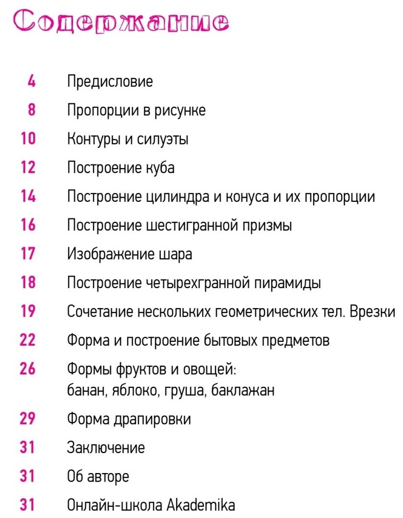 Книга очень маленькая по объёму, не книга - брошюра. Но очень информативная и денег своих стоит! Впервые я увидела её в ИРЛ магазине рублей за 500, и за такую цену брать бы не стала, но по акции в Лабиринте - самое то. Занимаюсь на курсах основами рисунка, искала ёмкое простое пособие по простым формам. Тут в самый раз: небольшой справочник, который удобно иметь под рукой. Разобрано построение простых форм, понятие перспективы с примерами, а также хорошо показано, как эти знания и навыки применяются при рисовании любых предметов с натуры.