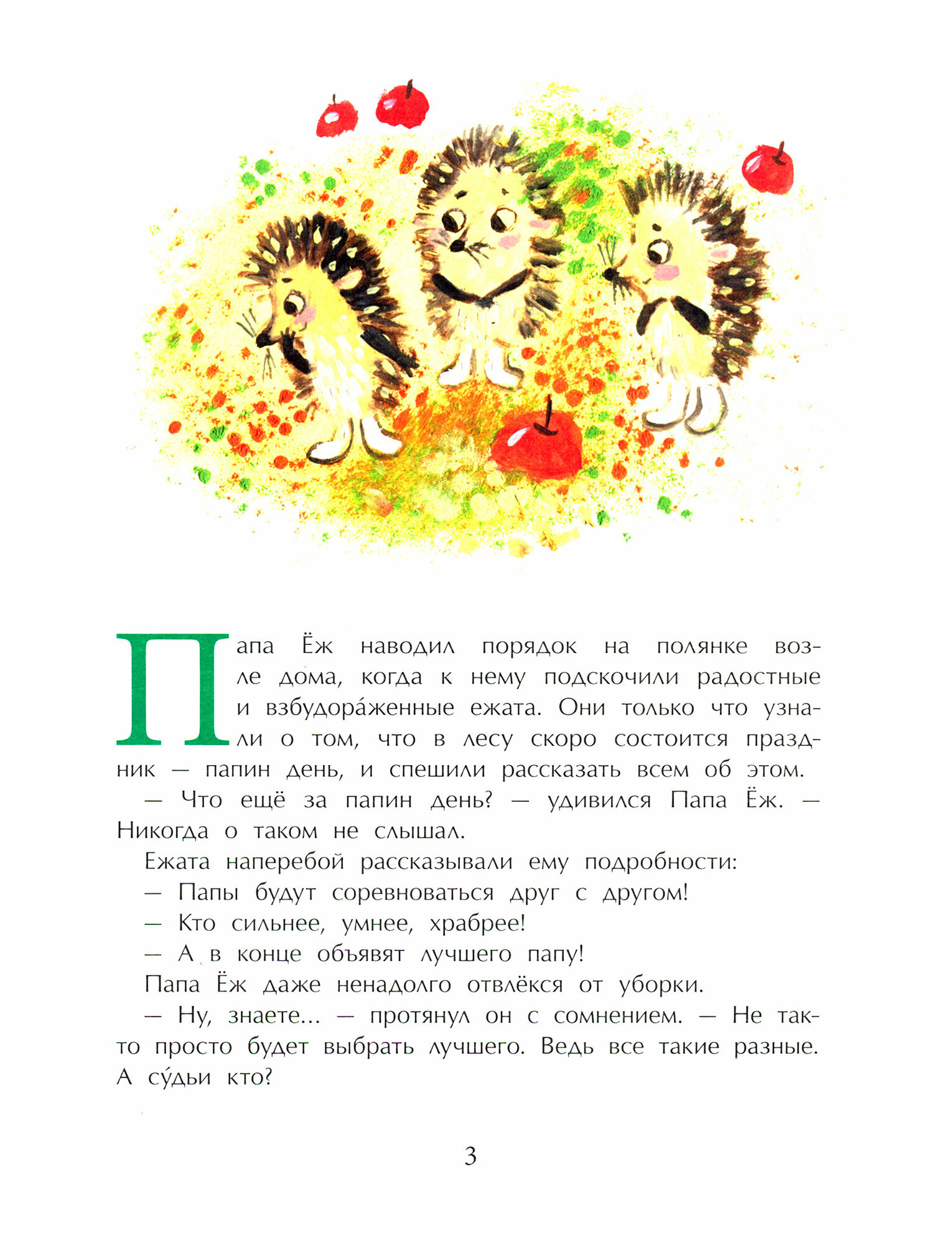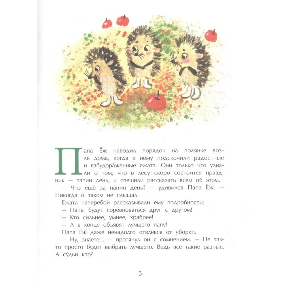 Сказок про маму очень и очень много, а про папу гораздо меньше. Но в последнее время все меняется к лучшему! Очень добрая и хорошая сказка, о том как ёжики переживали за своего папу. он же не такой сильный как медведь и не может показывать фокусы как папа лис. Но тут папа ёжик - это мечта любой мамы, который и детей спать уложит и старших деток уговорит помочь маме! Честно - покупаем эту книгу и даём читать папам, как пример, показать идеального папу - отлично! А для ребенка папа там самый лучший и любит семью и маму! Конец как и в любой детской книге замечательный, конечно папа самый лучший.