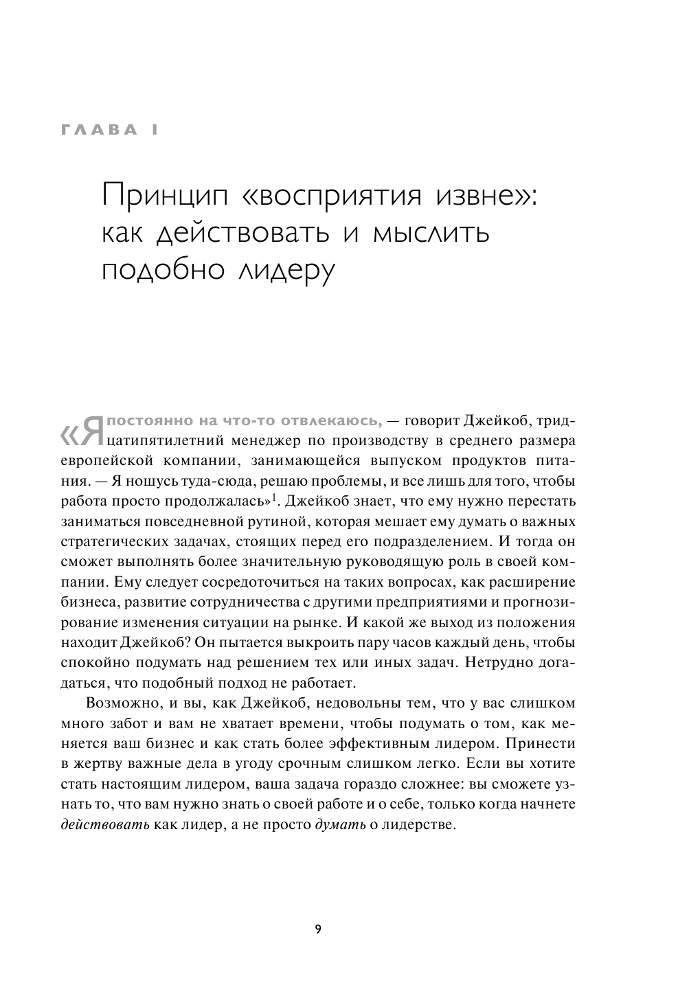 Как стать настоящим руководителем? Принято считать, что сначала нужно сформировать мышление лидера, потом, как следствие, меняется поведение. Что если этот порядок поменять местами? Автор книги "Действуй как лидер, думай как лидер" Эрминия Ибарра предлагает начинать с активных действий - брать на себя больше ответственности, общается с людьми, чьи взгляды не совпадают с вашими, участвовать в новых проектах. Все это неизменно приведет к изменению мышления. Следуя программе Ибарры, основанной на трех шагах, вы сможете стать лидером, которому доверяют, ради которого не боятся рисковать, которого любят и уважают.