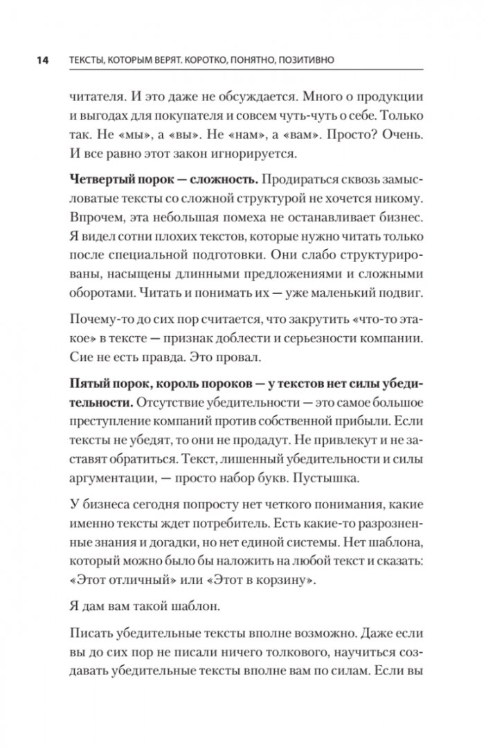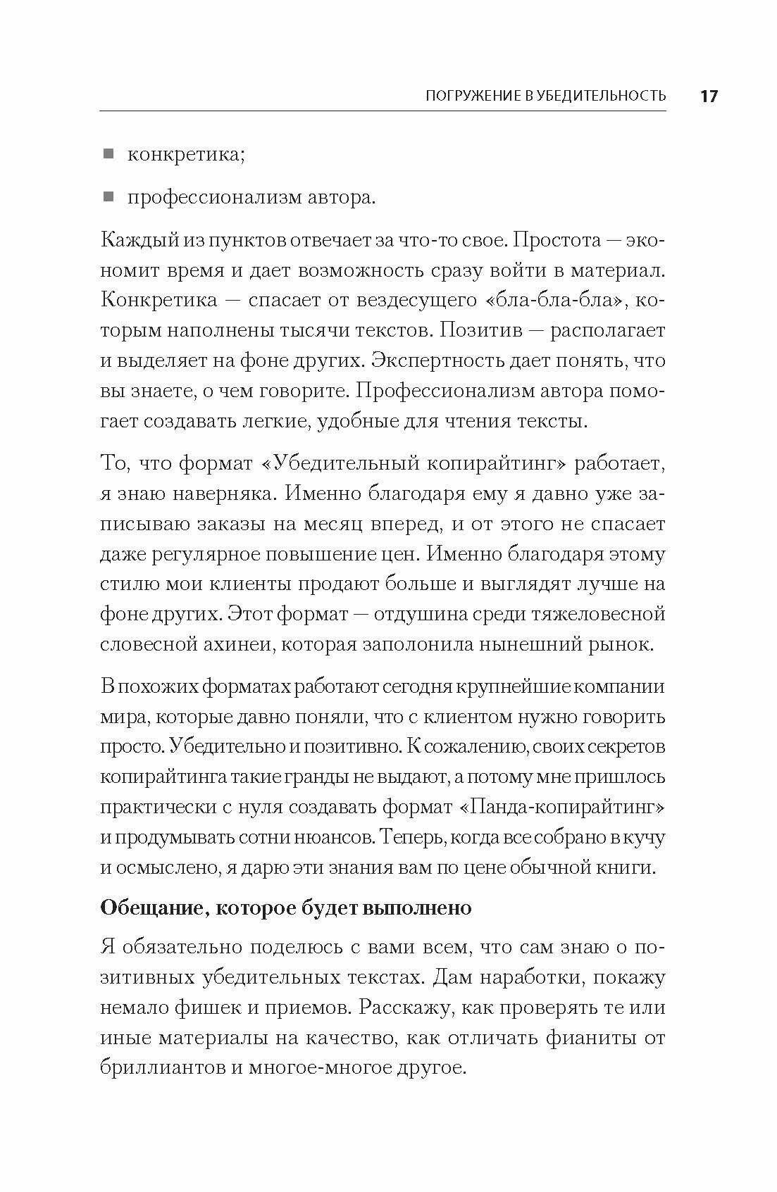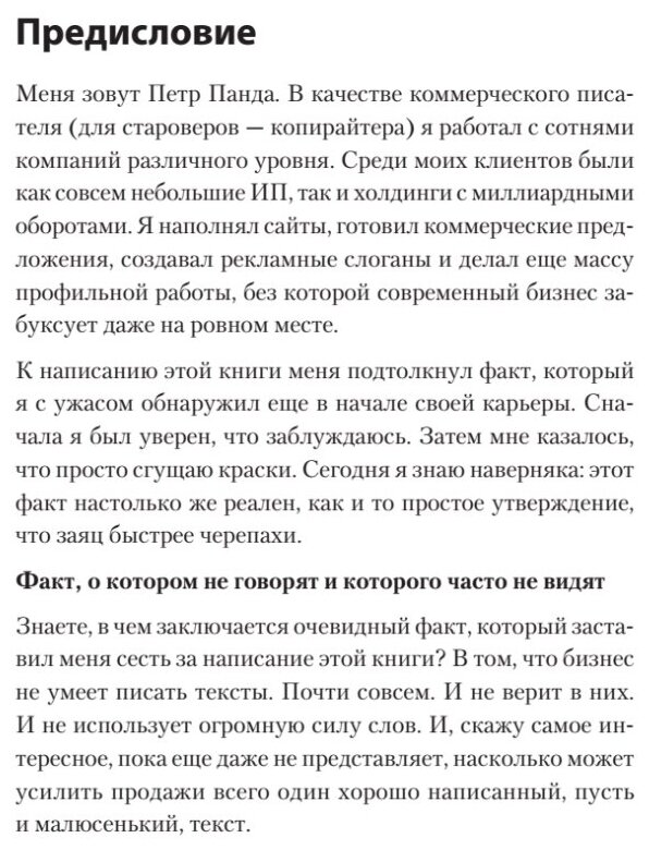 Я обожаю автора и его книги. Он для меня ориентир в профессии. Эту книгу считаю лучшей. У Панды свой стиль, своя методика, которой он обучает в своих книгах. Пособие приятно читать, сам текст, даже тем, кто не имеет отношения к копирайтингу. Описанные приёмы рабочие, полезные, эффективные. Много практики, мало воды. Но даже вода здесь по делу. Книгу постоянно перечитываю, очень помогает в работе.