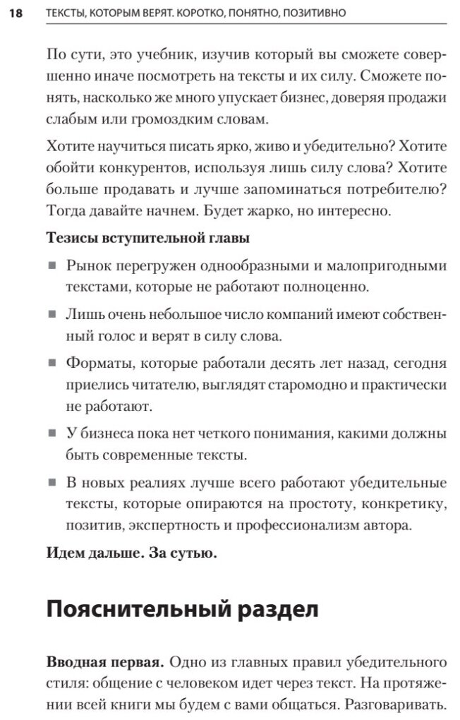 Подкупает книга в первую очередь тем, что информация подаётся простым языком, без заумных фраз и самолабзания автора. Каждая тема подкрепляется примерами, с разбором по предложениям. Так же разбираются сильные и слабые стороны текста, что даёт тебе уверенную почву под ногами. Отдельное gracias за пробелы между абзацами.