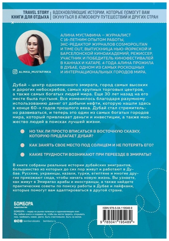 Слежу за Алиной в инстаграме, она очень талантливая и круто рассказывает. Книга замечательная. Понравилось, что в ней собрано много историй реальных экспатов, которые проживают в Дубае. Многие из них пробивались с самых низов, а кто-то так и не смог пробиться. Безумно интересно! -