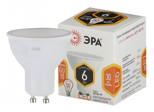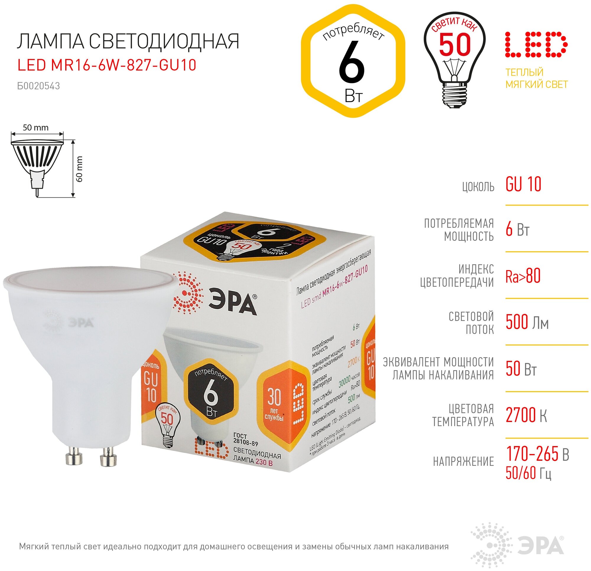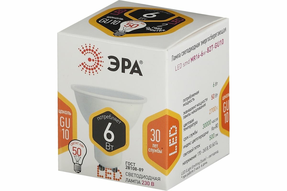 Лампа светодиодная ЭРА MR16-6W-827-GU10