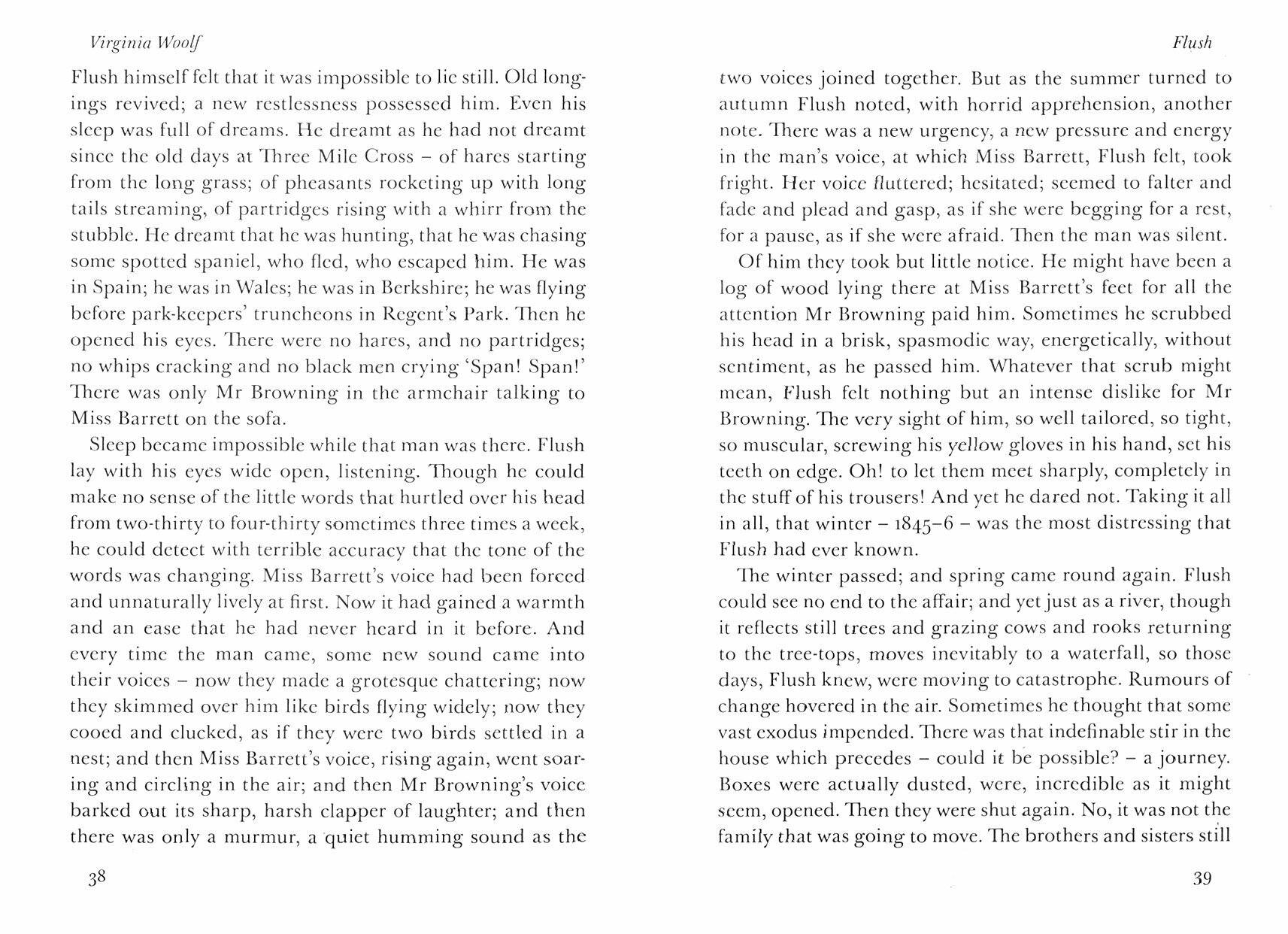 Кто бы мог подумать, что биография собаки настолько захватит меня! Но что удивляться? Тексты Вулф всегда магически завораживают. Остроумная литературная игра, "Flush" – биография Элизабет Барретт-Браунинг и сатира на социальные стереотипы английской знати. Книга описывает жизнь Браунинг через глаза ее собаки. Новелла сочетает документы и описания, позволяя почувствовать мир сквозь глаза животного. Связь между Элизабет и собакой преодолевает языковые и социальные барьеры. Флаш становится не просто питомцем, а сплетением чувств женщины и животного, что создает искренний портрет жизни поэтессы.