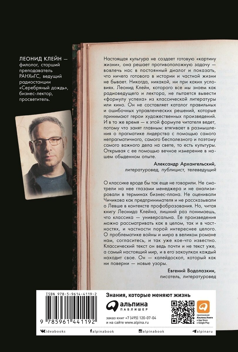 На книжной полке предпринимателя или управленца должно найтись место для художественной литературы, а классический кинематограф может оказаться полезнее лекций Илона Маска и Стива Джобса — в этом уверен Леонид Клейн. На ярких примерах и цитатах Клейн доказывает, что культура — инструмент универсальный, а литература, кино, театр способны стать ресурсом профессионального развития. И вот уже «бесполезная» классика рассказывает о стратегии и тактике, учит управлять командой, разговаривать и убеждать.ЦитатыЛюди ищут ответы на вопросы, которые им задают жизнь, работа, опыт. И вдруг оказывается, что эти ответы можно найти в культуре, в художественных произведениях.Я предлагаю посмотреть на свое дело, работу через призму искусства. Это будет как минимум интересно, а если же вы, дорогой читатель, сможете почерпнуть еще и что-то полезное, что пригодится в профессии, в бизнесе, на пути к успеху, то не такая, значит, она бесполезная, эта книга.Герои произведений, как правило, решают задачи — глобальные, локальные, личные. Иногда они делают это успешно, иногда — нет. Переживая вместе с ними перипетии сюжета, мы можем увидеть и понять их стратегию или тактику, которые ведут либо к победе, либо к поражению. Возможно, этот опыт поможет принять верное управленческое решение или сделать очередной шаг на пути личностного развития.