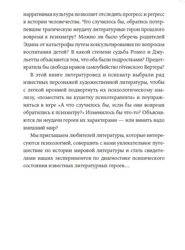 Что, если бы литературные герои прошлого и настоящего, потерпевшие трагическую неудачу, обратились вовремя к психотерапевту? Уберегла бы родителей царя Эдипа от катастрофы консультация по вопросам воспитания детей? Развернулась бы иначе история Ромео и Джульетты, если бы они были старше? Может, Дракулу не понимали окружающие, а Волан-де-Морта недолюбили в детстве? Означают ли эротические фантазии Кристиана Грея из «Пятидесяти оттенков серого» нехватку в нем мужественности?