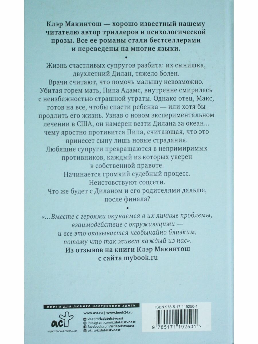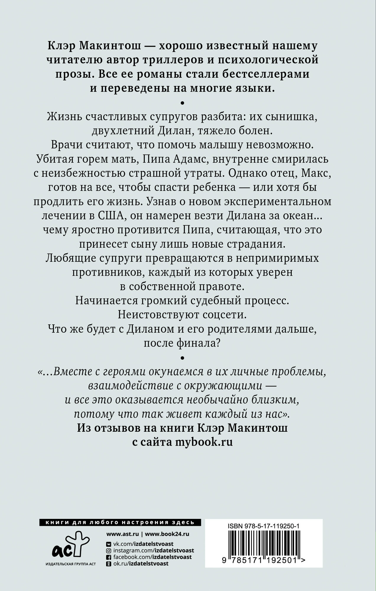 Очень сильная и тяжёлая книга о нелёгком выборе для своего ребёнка. Необычное деление сюжета после суда. Интересно было почитать две разные концовки и не гадать, а что если?, как это делали главные герои. Немного смутил финал глав от лица Пипы, для меня это было неожиданно, я рассчитывала немного на другой финал.
